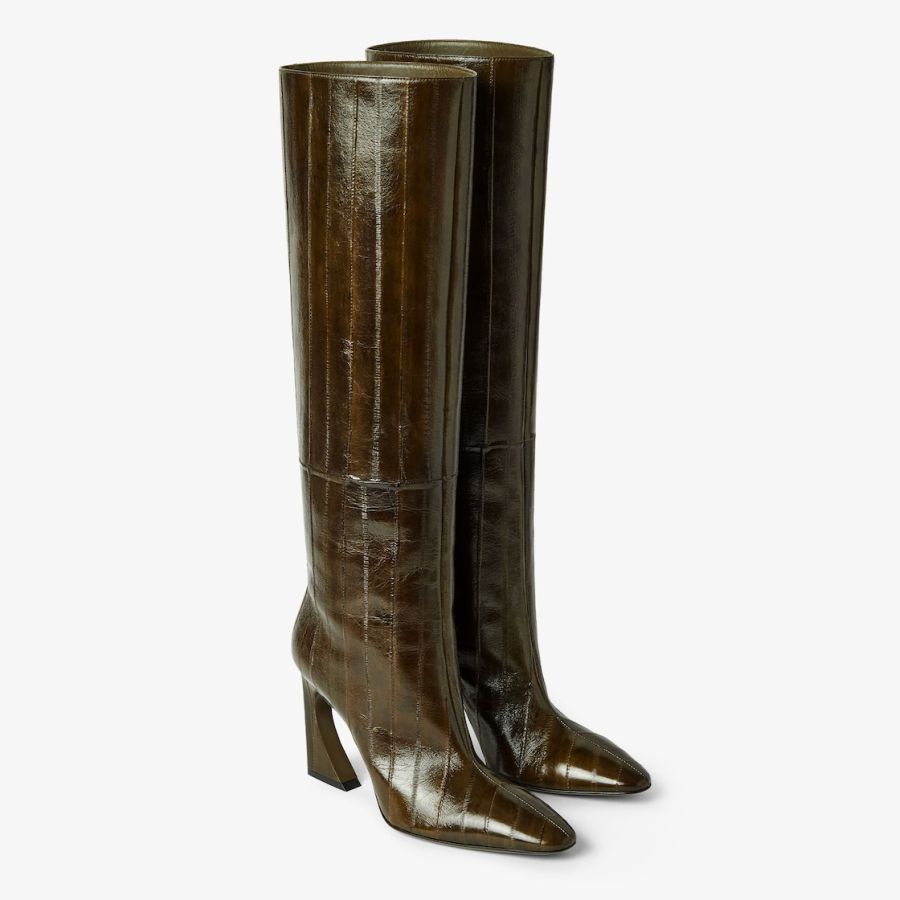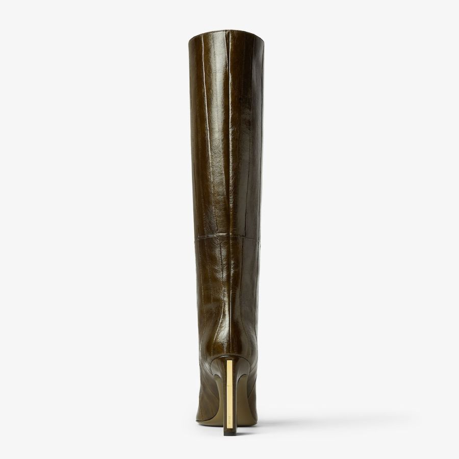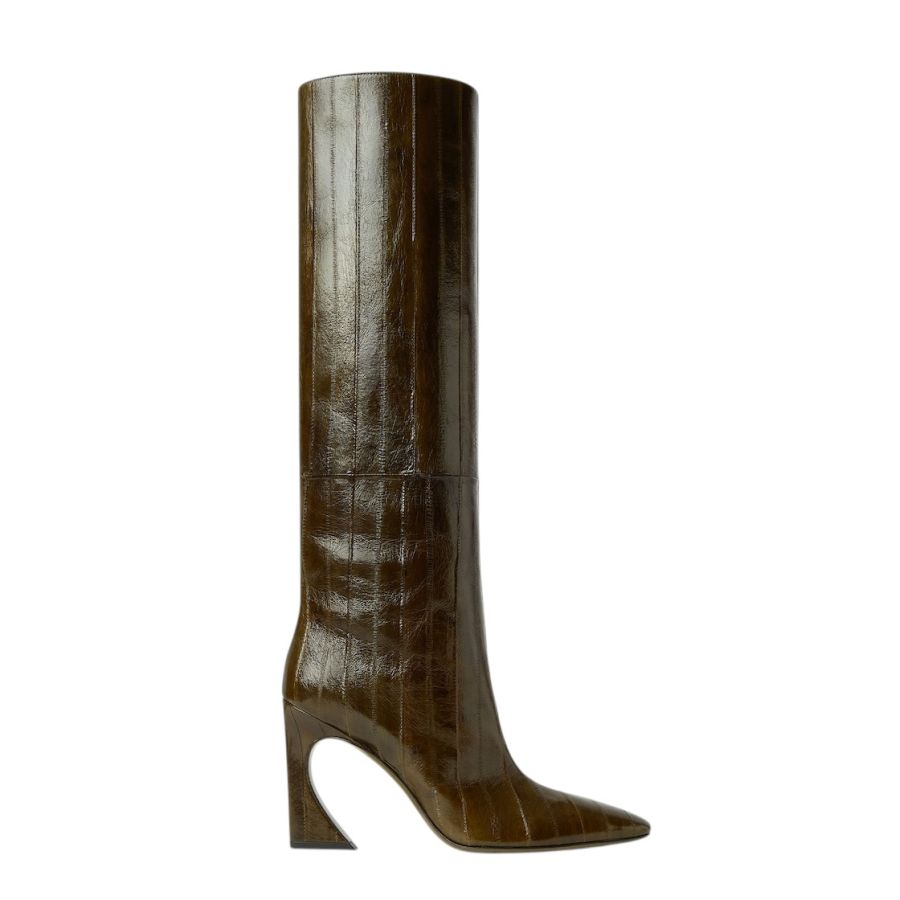 Tubular boots with tapered toe and high heel featuring the iconic Arco line, customised with metal detail and engraved logo. Made of shiny olive green hagfish leather. Covered heel and leather sole.