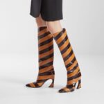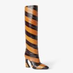 Tubular boots with tapered toe and high heel featuring the iconic Arco line, customised with metal detail and engraved logo. Made of glossy hagfish leather, inlaid to create a chevron motif in light and dark brown. Covered heel and leather sole.