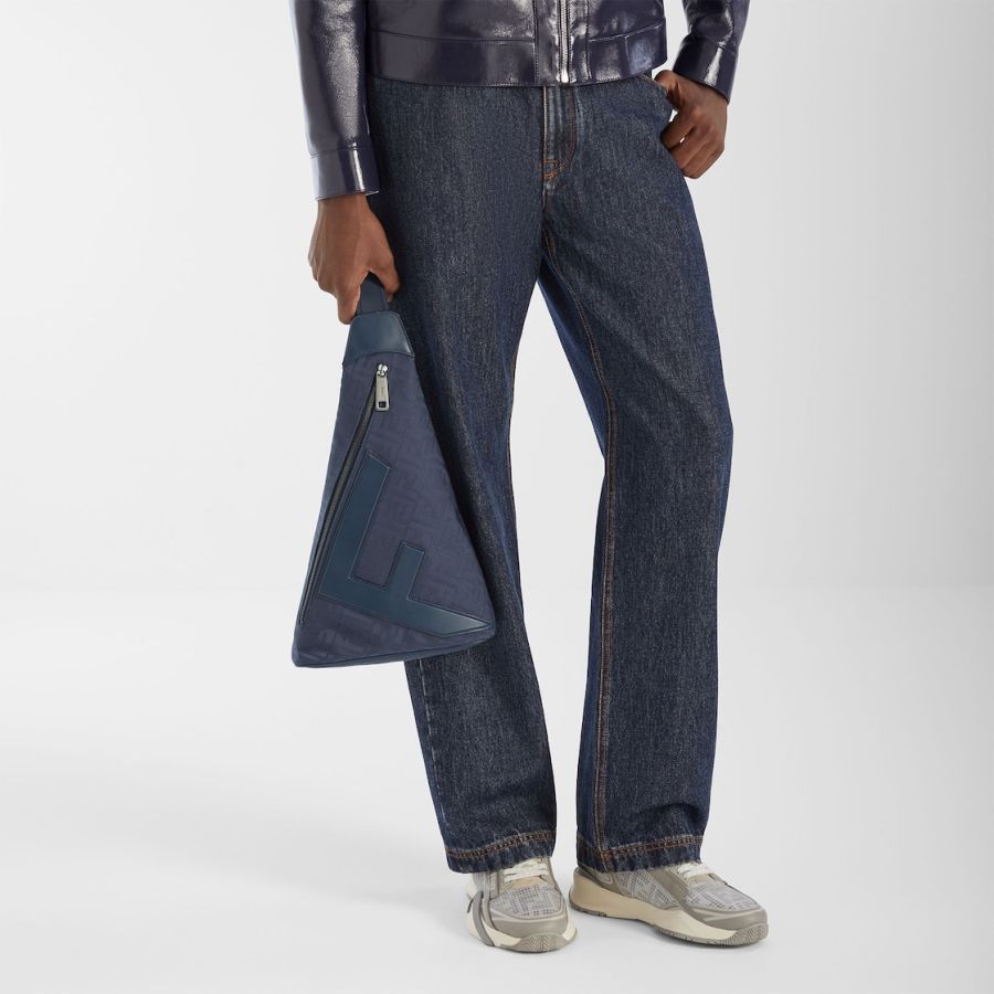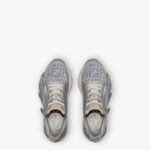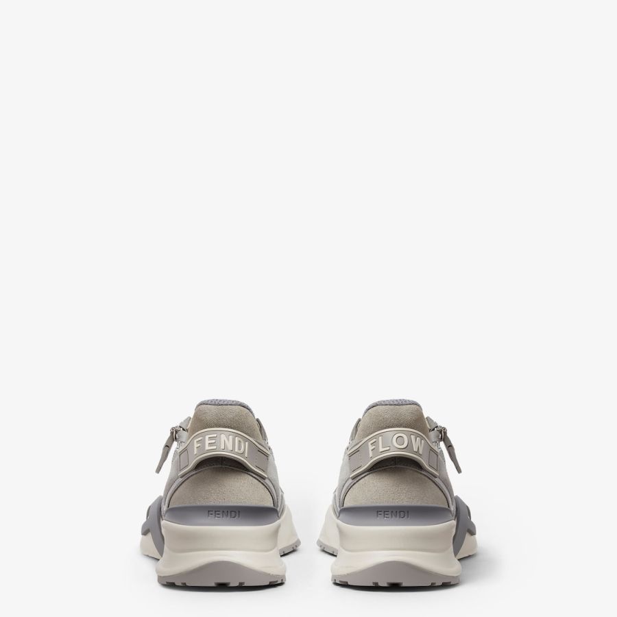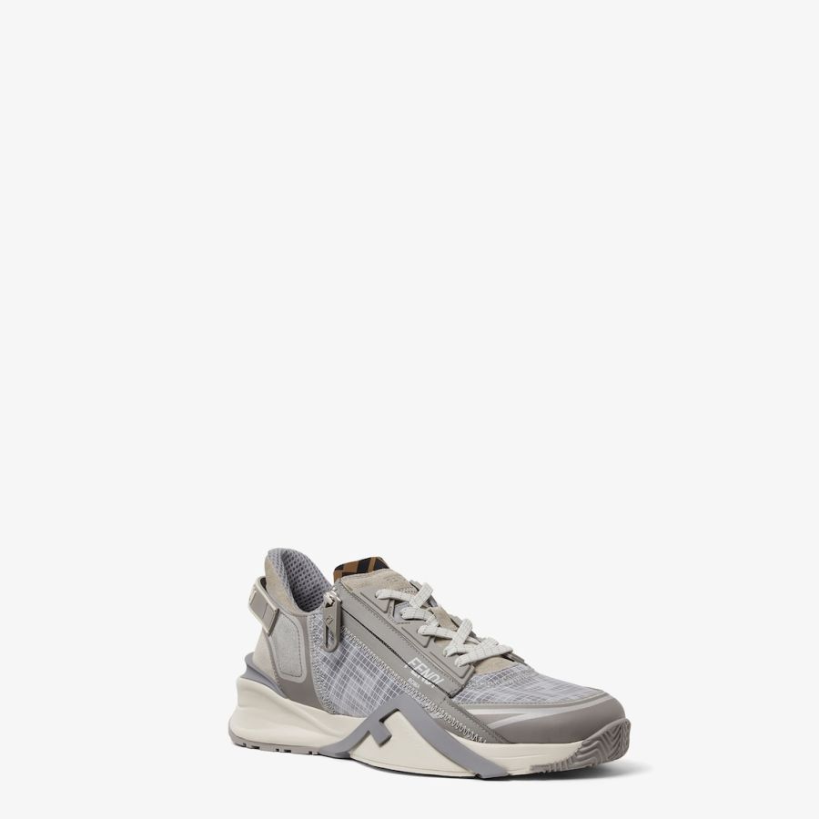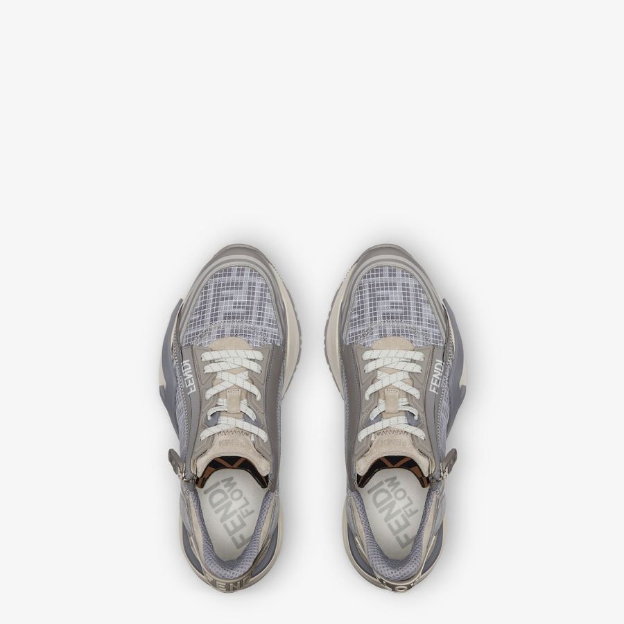Slip-on trainers with elasticated laces, side zip and corrugated soles with engraved F. Fendi Flow lettering embossed on the heels. Made of FF motif mesh fabric bonded with matte ripstop nylon in grey. Tone-on-tone suede details and screen-printed Framilion tape. Embellished with a brown FF Lycra® tongue. White rubber soles with grey diagonal F detail.