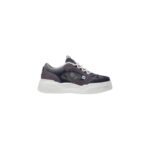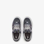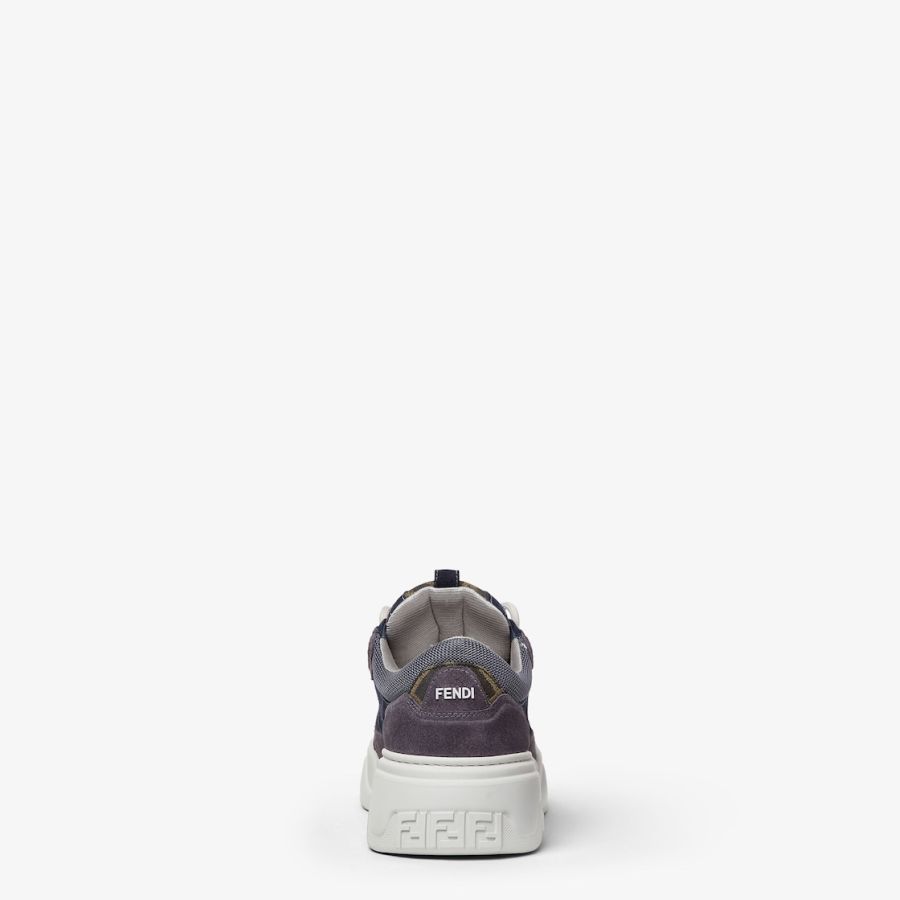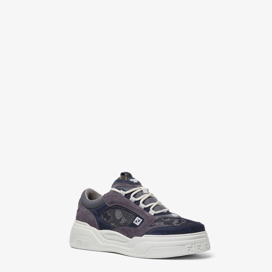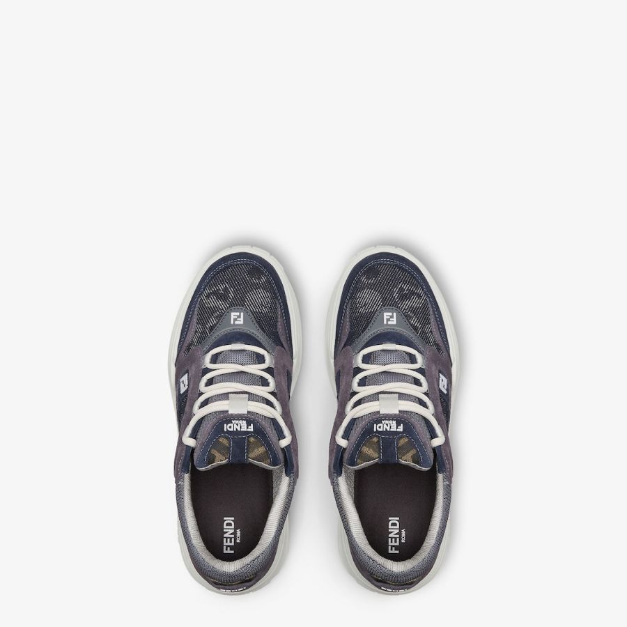 Fendi Force lace-up low-tops. Made of denim with a blue Fendi Falena jacquard weave and tone-on-tone padded elements. Decorated with smoke grey suede inserts, injections and indigo technical fabric. FF embroidery side detail and lightweight, white rubber soles with the FF motif on the toe and heel.