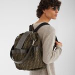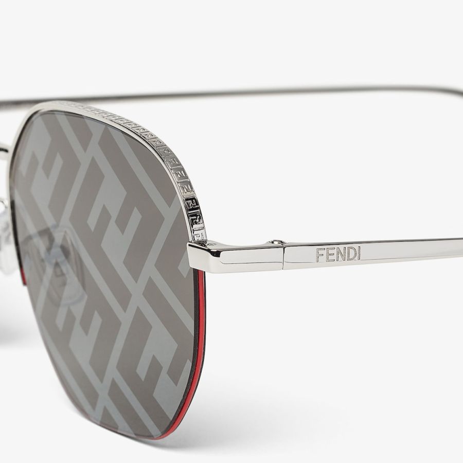 Round frames in palladium-finish metal. The front of the frame features an FF pattern engraved on the upper part and a red metal thread on the lower edge. Grey lenses with all-over silver mirror-effect FF logo. Adjustable nose pads branded with the Fendi logo.