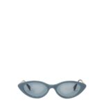 Fendigraphy sunglasses with elongated cat-eye front in denim blue acetate. Large gold-colour metal temples, decorated with three-dimensional Fendi Roma lettering and acetate tips matching the front. Blue lenses.