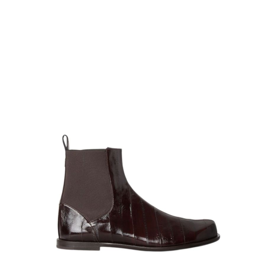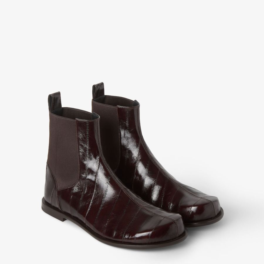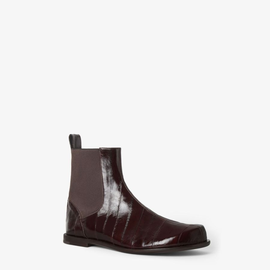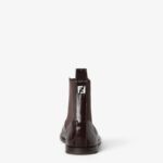 Chelsea boots featuring the iconic rounded toe of the Fall-Winter 2025 fashion show. Made of shiny brown hagfish leather. Finished with matching elastic side inserts. Metal FF detail with shiny palladium finish on the heel, with hagfish leather loop. Leather soles.
