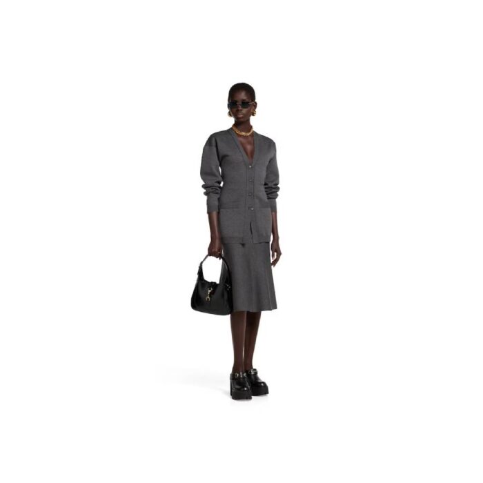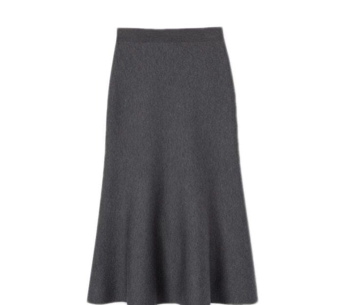 The Pre-fall 2025 collection introduces a new take on warm materials on sophisticated knitwear pieces, in traditional and contemporary silhouettes. This skirt appears in extra fine wool with a wavy skirt.