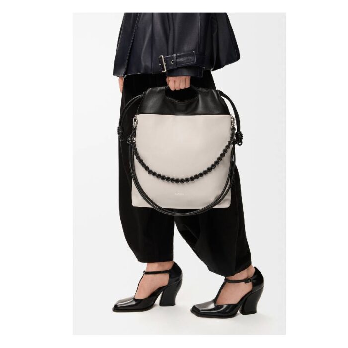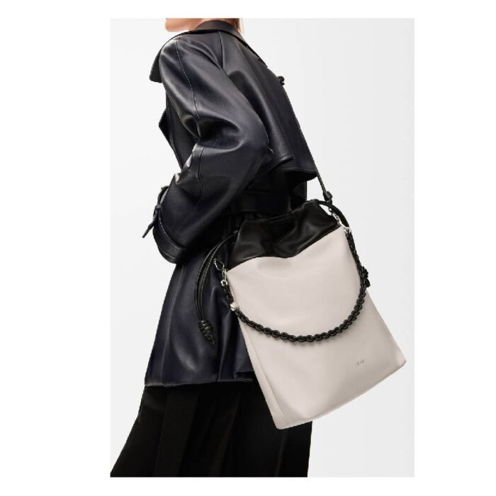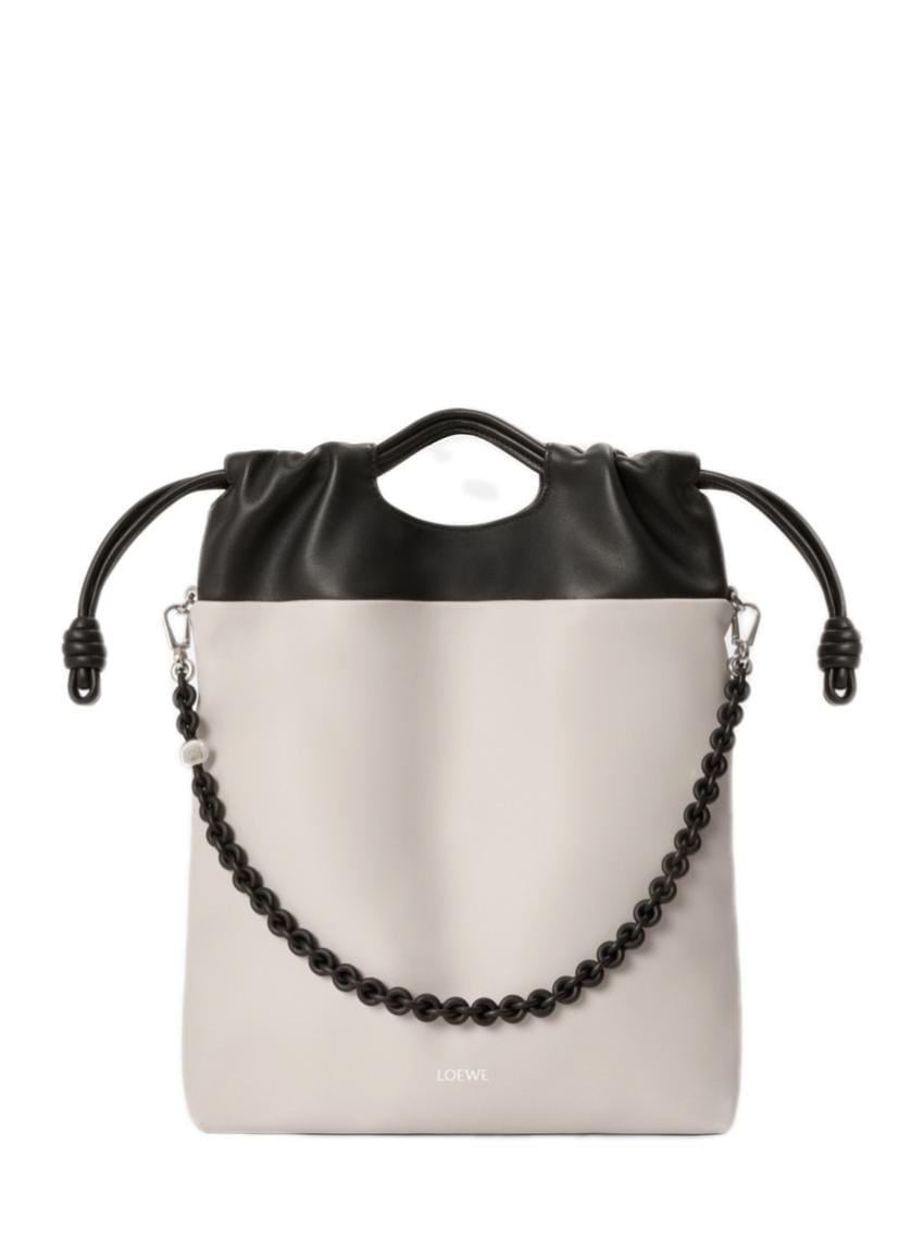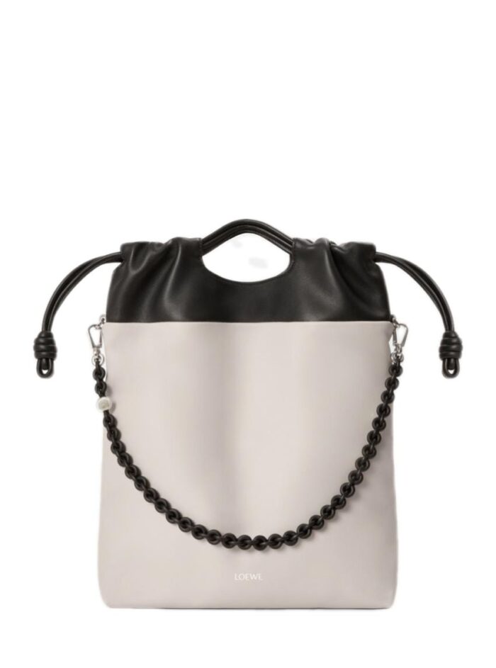 The Flamenco purse tote is a functional and soft bag with a vertical shape, historical knot drawstrings, and a tonal donut chain that matches its contrast top. This version is crafted in mellow nappa lambskin.
