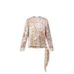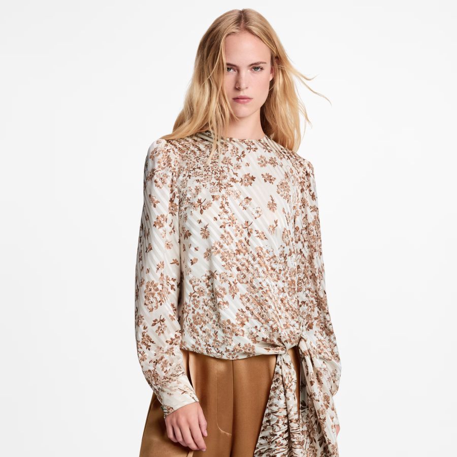 This blouse has a chic, modern look in airy silk twill featuring a romantic jacquard of stripes and flowers. The long sleeves are gathered around the shoulders to emphasize the fluidity, while the left hip is finished with a breezy knotted tie that gracefully drapes to the side. Fastened at the back with an elegant keyhole neckline.