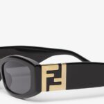 Forever Fendi oval glasses in black acetate. Wide temples inlaid with a large gold-colour metal FF. Smoke grey lenses.