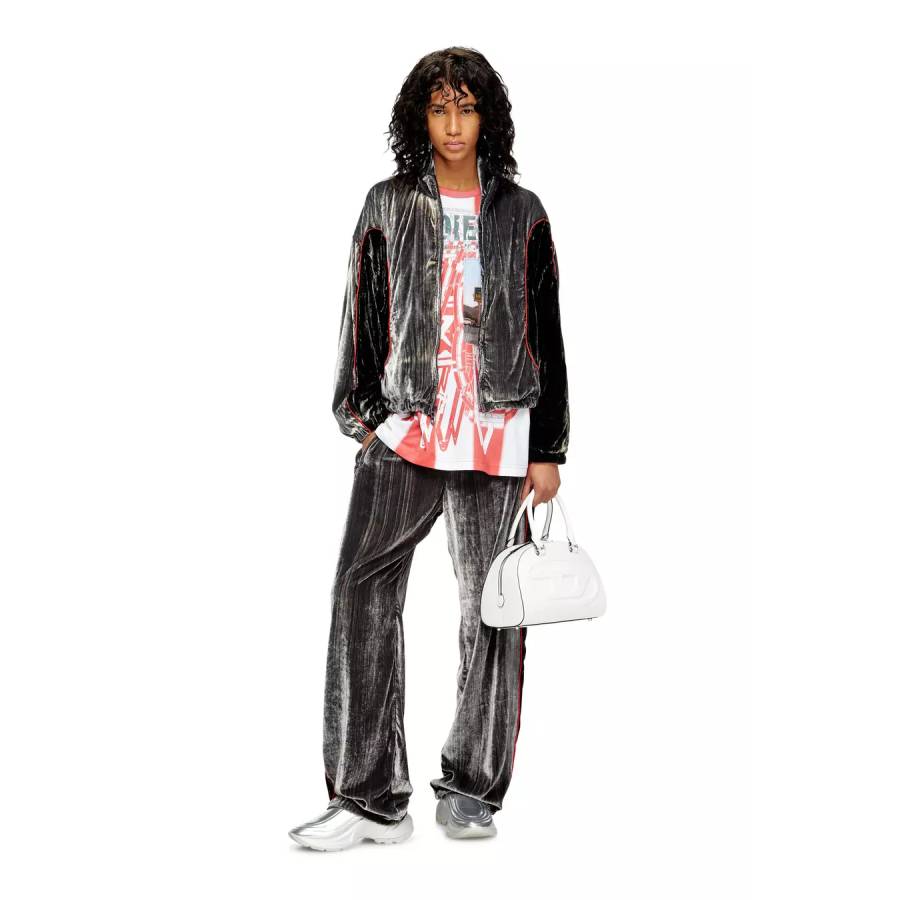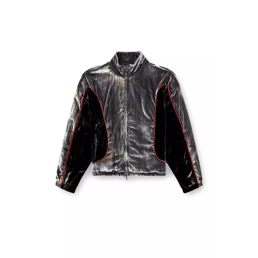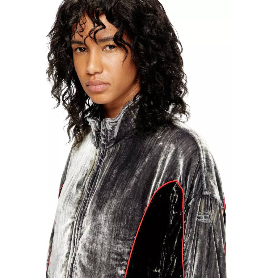 This all-gender track jacket is made from a fluid blend of nylon and responsibly-sourced viscose, treated for a vertical streaky effect. Its relaxed silhouette is defined by a high neck and piped contrast inserts at the sides and sleeves. Finished with Oval D embroidery.