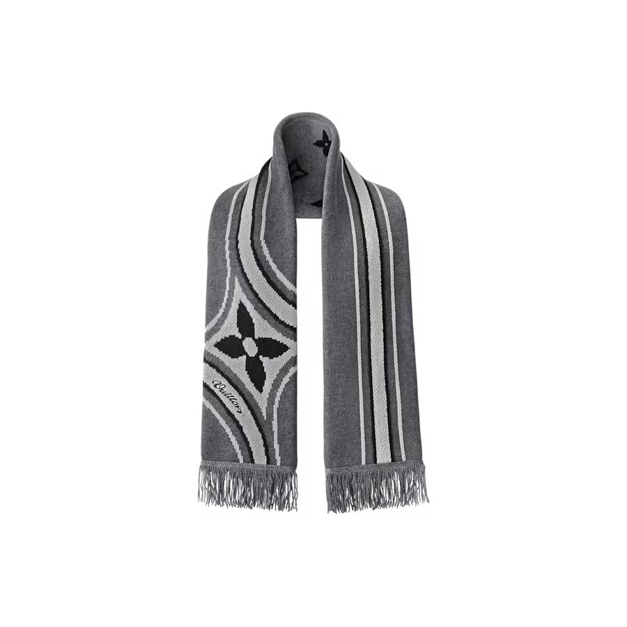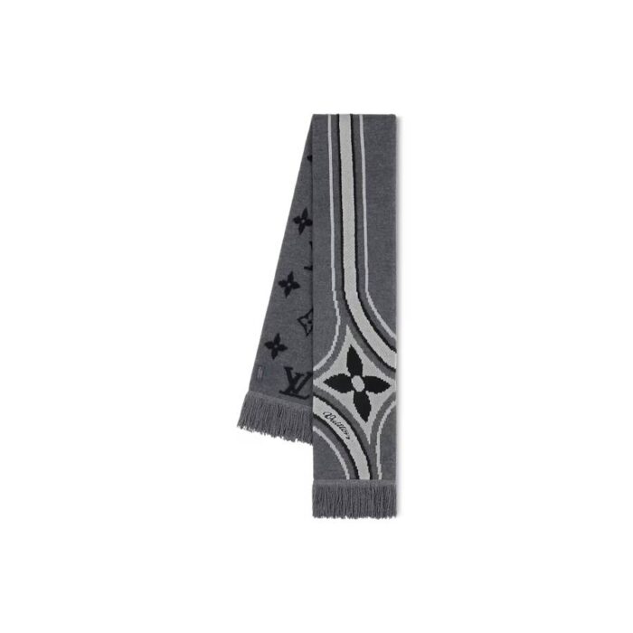 Made in Italy, the graphic flower scarf is a chic, grey design with black and white curved lines and a Monogram Flower. Nestled discreetly inside the design is the cursive “Vuitton” signature from Men’s Ready-to-Wear. The wool-blend style is soft and warm, its pleasurable texture enhanced by the plentiful fringes.