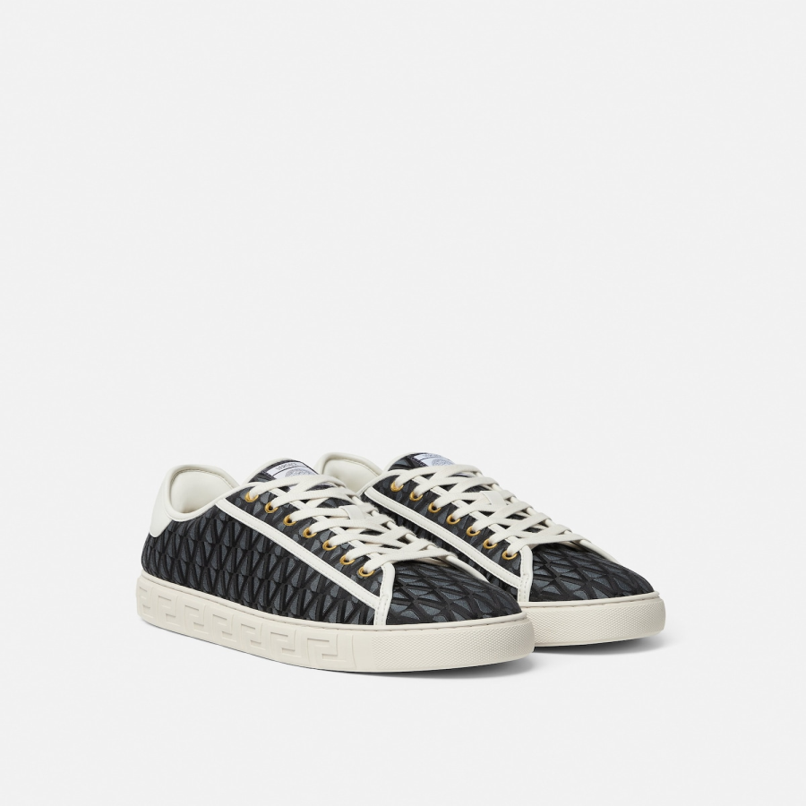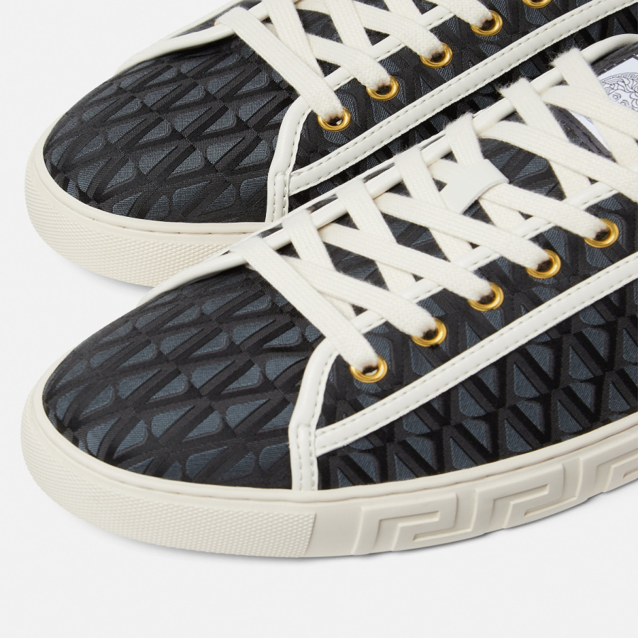 The low-top silhouette is characterized by an engraved Greca pattern on the soles and features a jacquard V Allover pattern on the uppers. A Versace Logo stamp at the back accents the style. Greca sneakers are made using responsible materials with certified recycled content and/or derived from renewable origin.