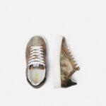 The low-top silhouette is characterized by an engraved Greca pattern on the soles and features metallic laminated lizard-effect calf leather uppers. A Versace logo stamp at the back accents the style. Greca sneakers are made using responsible materials with certified recycled content and/or are derived from renewable origin.