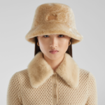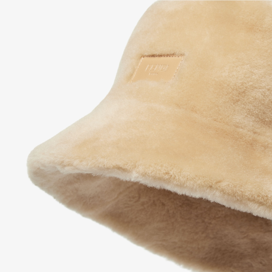 Narrow-brimmed bucket hat in beige long-haired shearling. Embellished with brown leather Fendi Roma patch on the front. Warm wool knit lining for enveloping comfort.