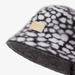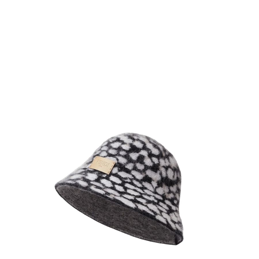 Cloche hat made in luxurious wool and mohair yarn with the collection’s Falena Dots motif in black and white. Finished with a beige leather patch on the front and embossed Fendi logo.