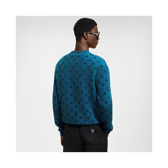 with an eye-catching iridescent knit. Crafted from a cotton blend, it is adorned with an allover Monogram motif with a gradient effect, with shifting and changing vibrant blue and black tones. A light layer for spring, this sophisticated piece brings a standout signature twist to casual looks.