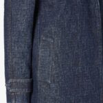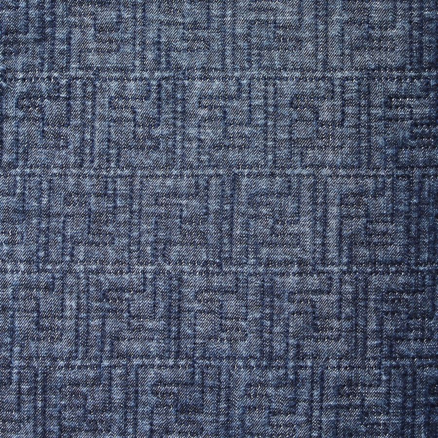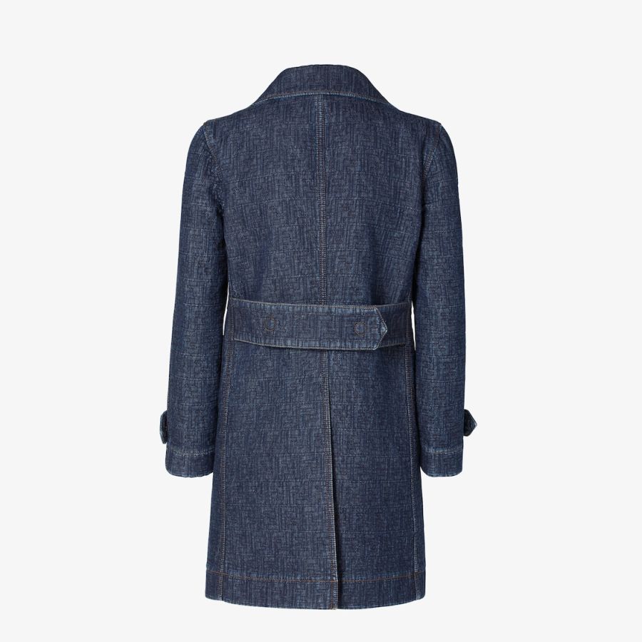 Straight-cut double-breasted midi jacket. Lapel collar and long sleeves with cuff straps. Welt side pockets. Front fastening with concealed press studs. Made of dark blue denim with all-over quilted FF motif. Contrasting tobacco-coloured stitching.