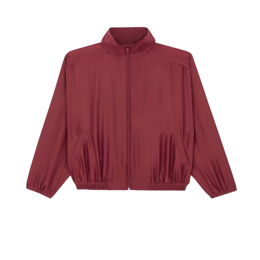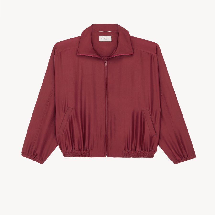 zip jacket made with certified silk, featuring a stand collar, shirred hem, and elasticized cuffs.