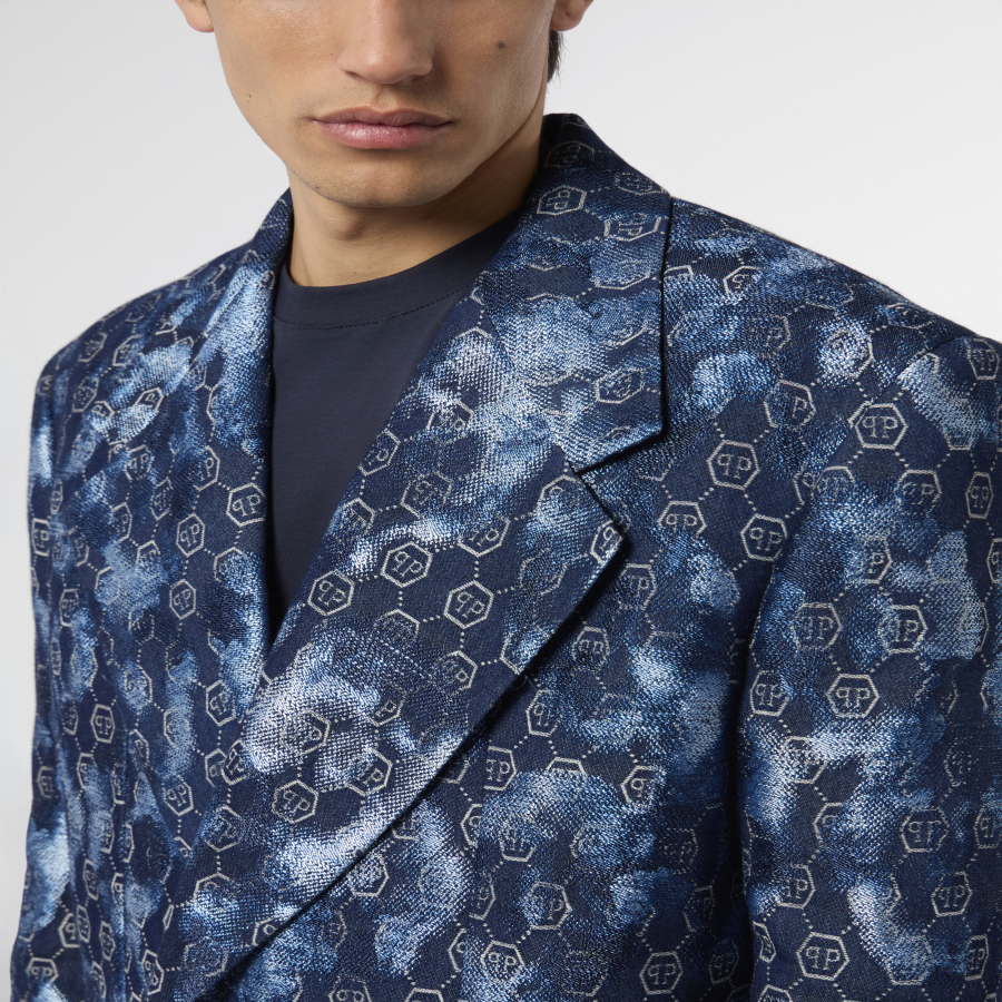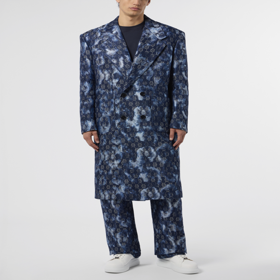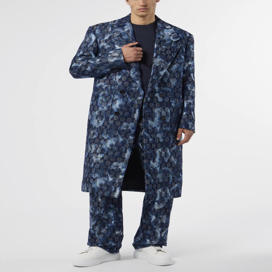 Full round originality. Check out this double-chest denim overcoat featuring pure Plein details.