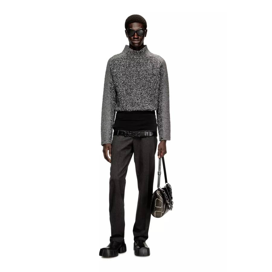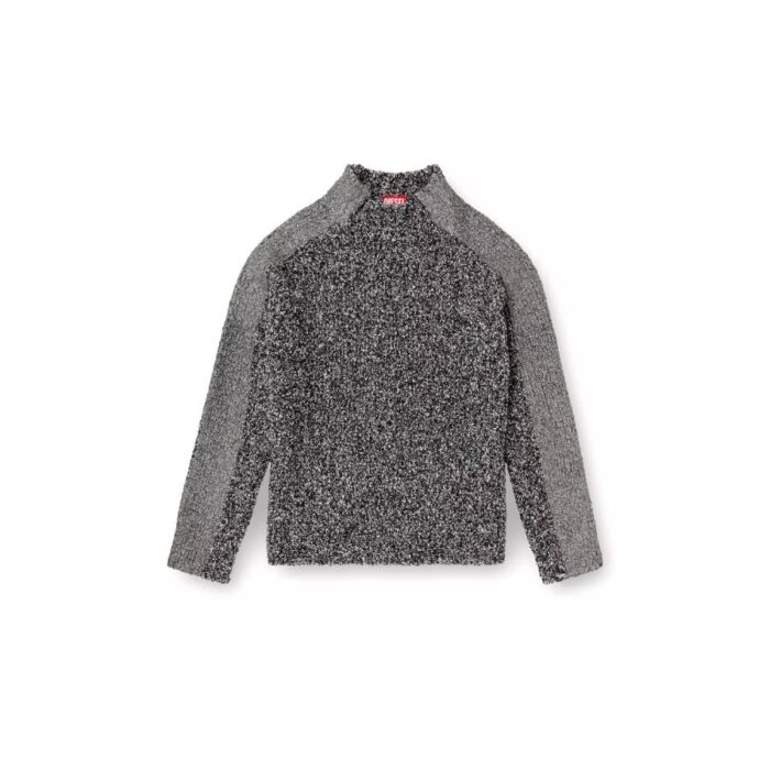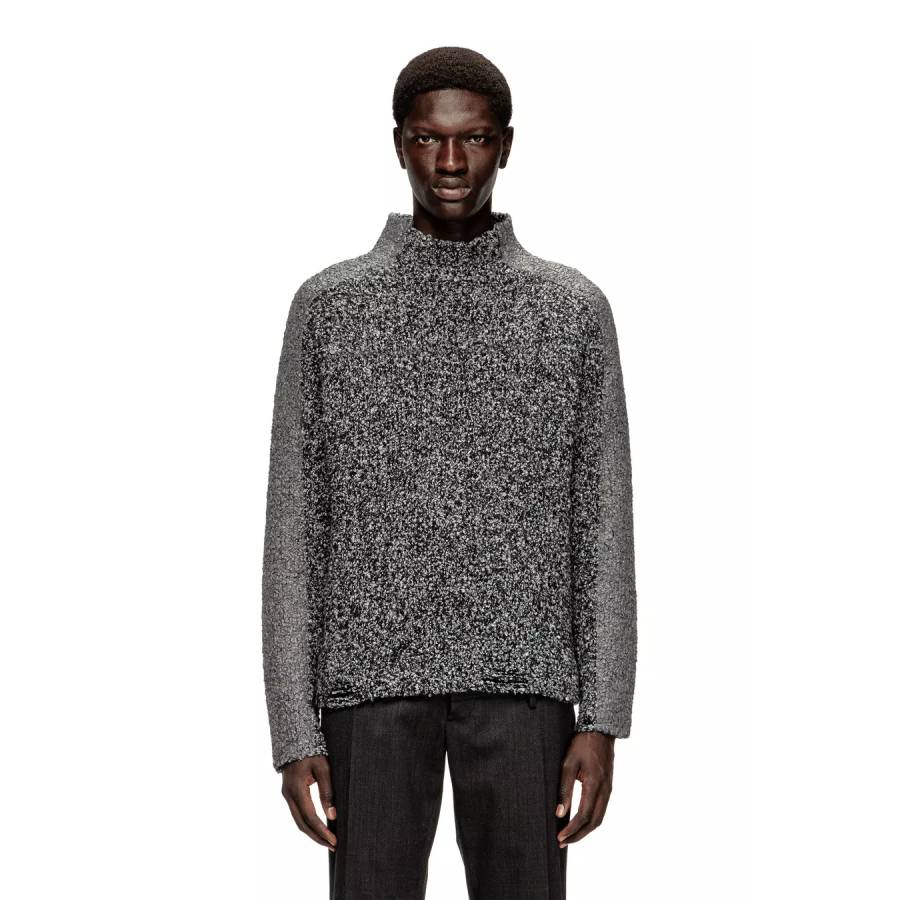 An exclusive FW25 Runway Show piece, this men’s sweater subverts bouclé tweed, canonical in tailoring. Designed for a regular fit with an elegant funnel neck, it’s knitted using wool-blend mouliné bouclé yarn, resulting in a nubby texture and speckled appearance. The printed bands down the sleeves add a hit of sporty disruption.