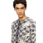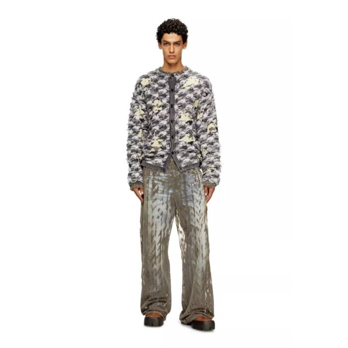 An exclusive FW25 Runway Show piece, this men’s cardigan is a perfect example of the collection’s aesthetic principle – disrupt and elevate. It reinterprets houndstooth checks, a classic pattern synonymous with refinement, as an artisanal jacquard knit full of floating threads and destroyed devoré effects. Ribbed trims outline the oversized crewneck silhouette, complete with buttons down the front.