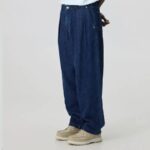 The &Kin Brett Pleated Taper Pant is crafted of rope twill cotton denim and features a shank closure on the front with zip-fly, rivets at the front hand pocket, patch pockets on the back, and a leather patch on the back of the waistband.