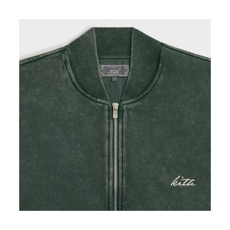The Antique Wash Avery Bomber Jacket is crafted of antique-washed 445GSM cotton fleece, featuring a lined interior, ribbed trim at the neckline, sleeve cuffs, and hem, and zip-front closure with Kith hardware. It is complete with pockets at the sides and Kith embroidery at the chest.