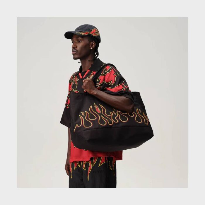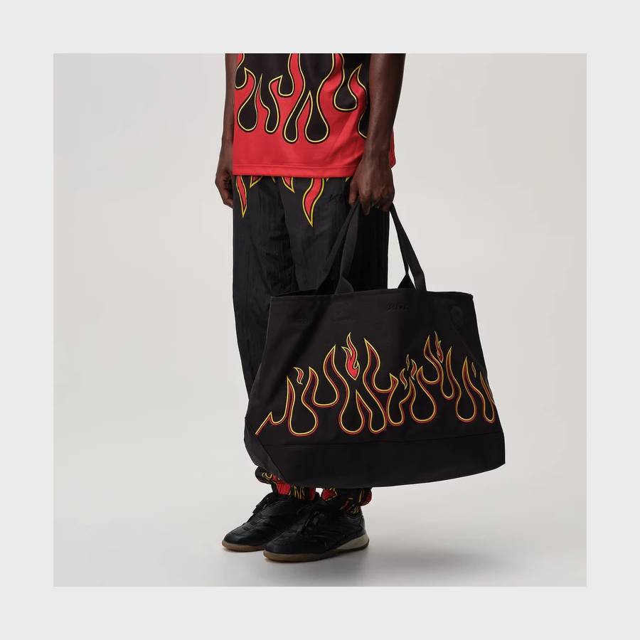 The Kith for adidas Football Flame Tote is made of cotton canvas, featuring a polyester lining, edge-stitched detailing, and flame artwork throughout. It is complete with reinforced top handles, an internal slip pocket, and embroidered branding.