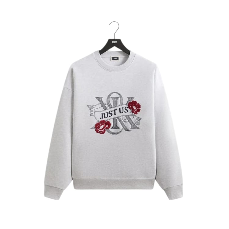 The Kith Just Us Crewneck is crafted of 400 GSM cotton fleece, featuring a ribbed neckline, sleeve cuffs, and waistband. It is finished with K&K Floral Crest embroidery at the chest. It is designed to be oversized with drop shoulders.