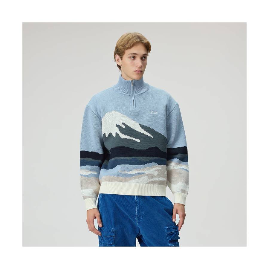 The Scenic Winter Wyona Quarter Zip Sweater is crafted of cotton with all-over landscape artwork. It features a Kith-branded quarter zipper closure, Kith embroidery at the chest and knitted rib at sleeve cuffs and hem.