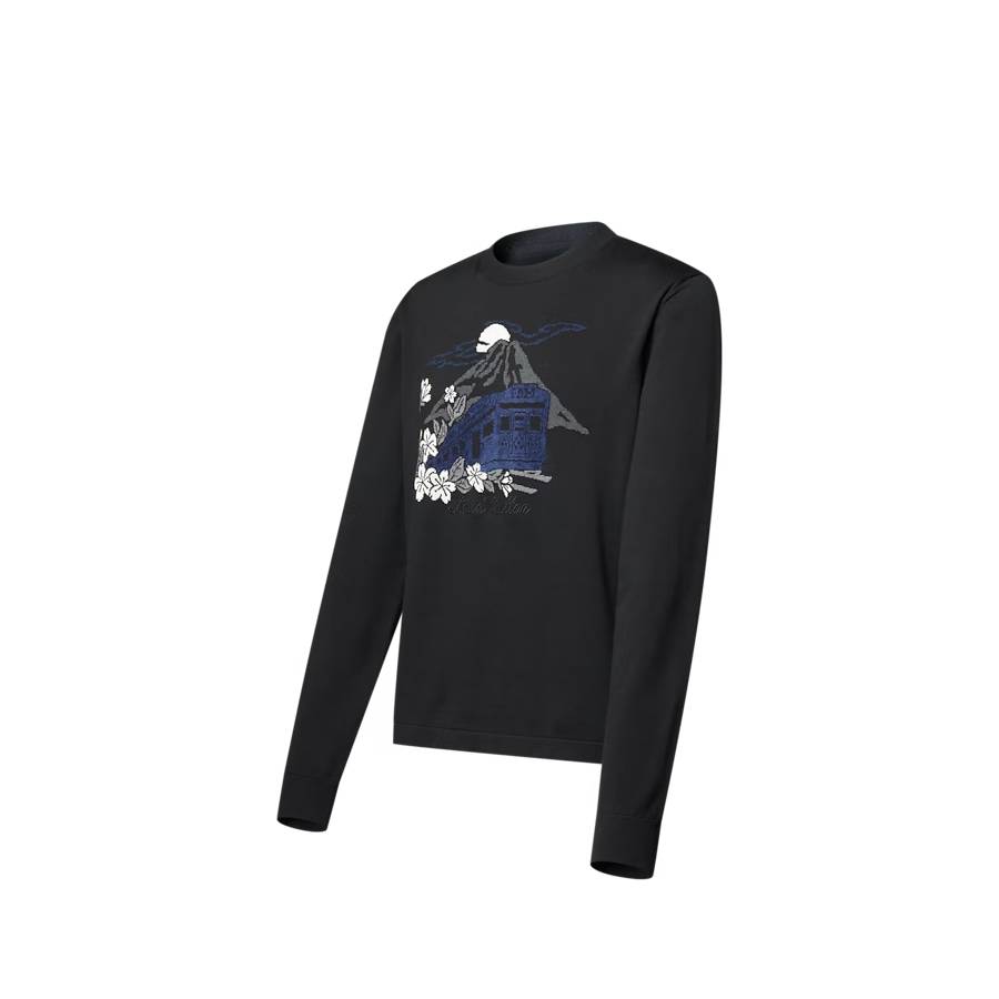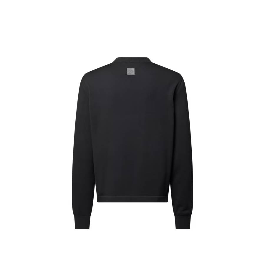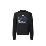This black fine-knit crewneck in a cotton-silk blend is adorned with a graphic LV Japan Sketch motif from the Fall-Winter 2025 show. Meticulously worked with a combination of intarsia knit and embroidery, it lends a graphic signature accent to everyday looks. A black leather Marque L.Vuitton Déposée label discreetly signs the back.