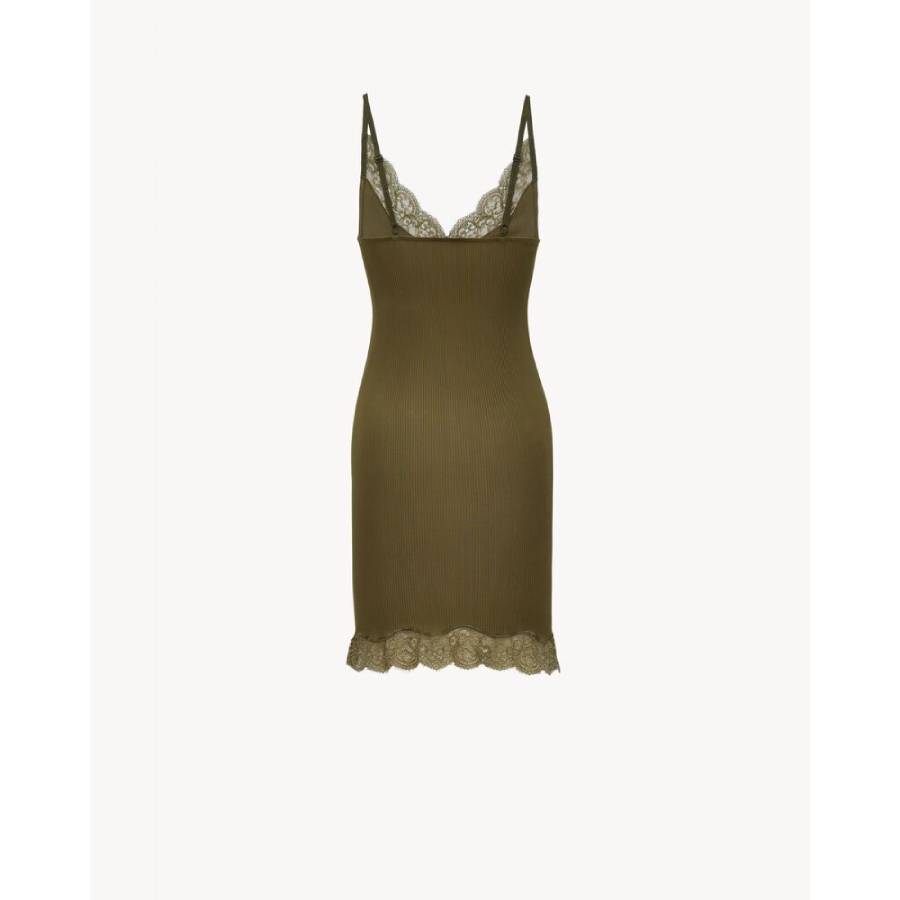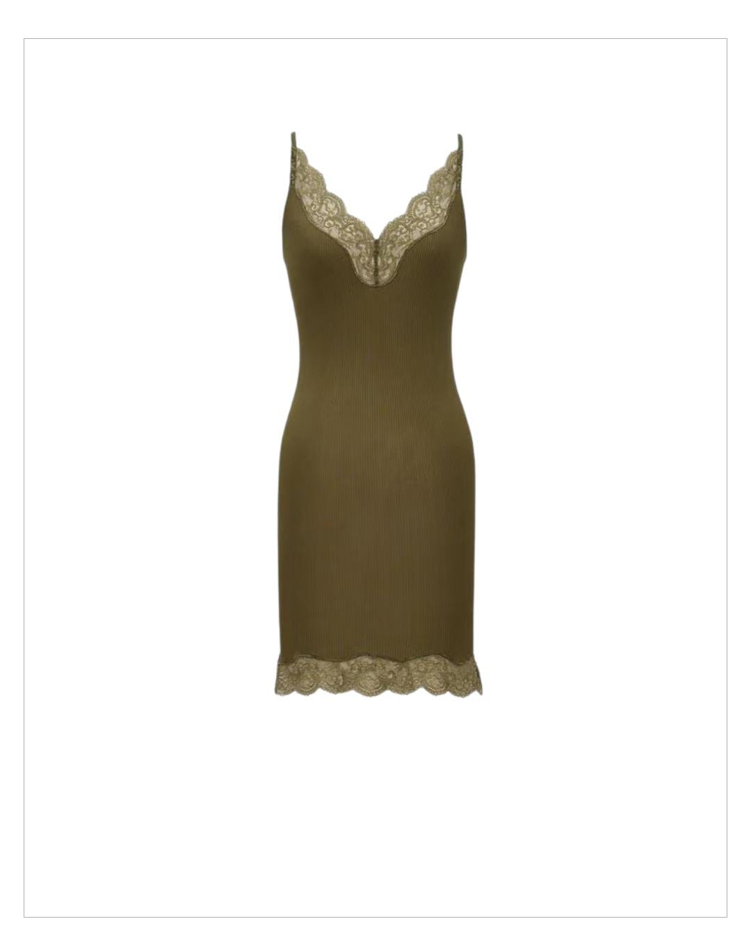semi-sheer, ribbed, knee-length slip dress made with certified silk, featuring scalloped lace trim, a V neckline, and adjustable spaghetti straps.