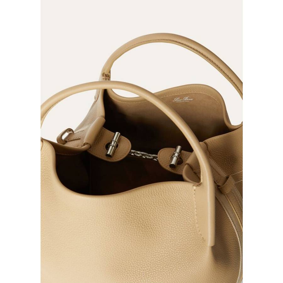 features two holes, so its length can be adjusted, allowing the bag to be carried by hand, over the shoulder or as a crossbody styleBejeweled metal inside closure with Antique Silver finishLightly padded and lined in soft suedeRemovable, coordinated inside leather pouch that attaches to the bag with a toggle Contrasting-colored, embossed Loro Piana logo on the frontOutside base lined in leatherComposition: 100% CalfskinSpecific Features: 100% Suede