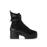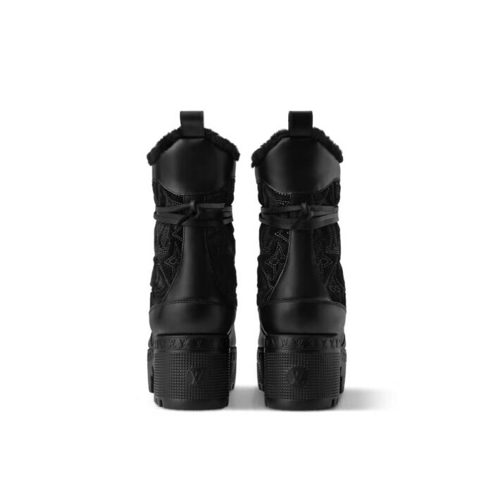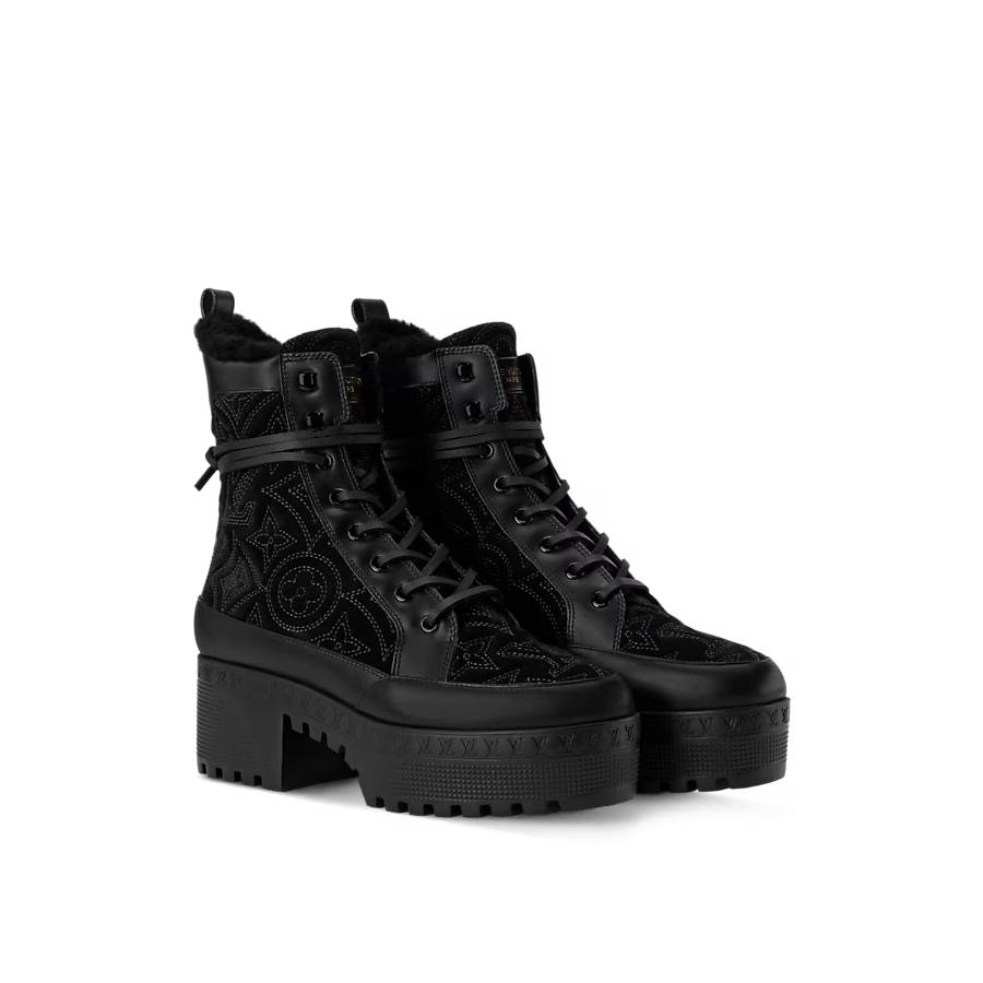 The emblematic Laureate platform desert boot is reinterpreted in Monogram-embroidered suede calf leather with smooth leather trim. Key details of this design are its cozy shearling lining and long leather laces, which wrap around the ankle. The treaded rubber outsole is decorated with a row of LV Initials, inspired by the lozine edging of Louis Vuitton trunks.