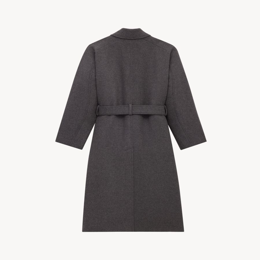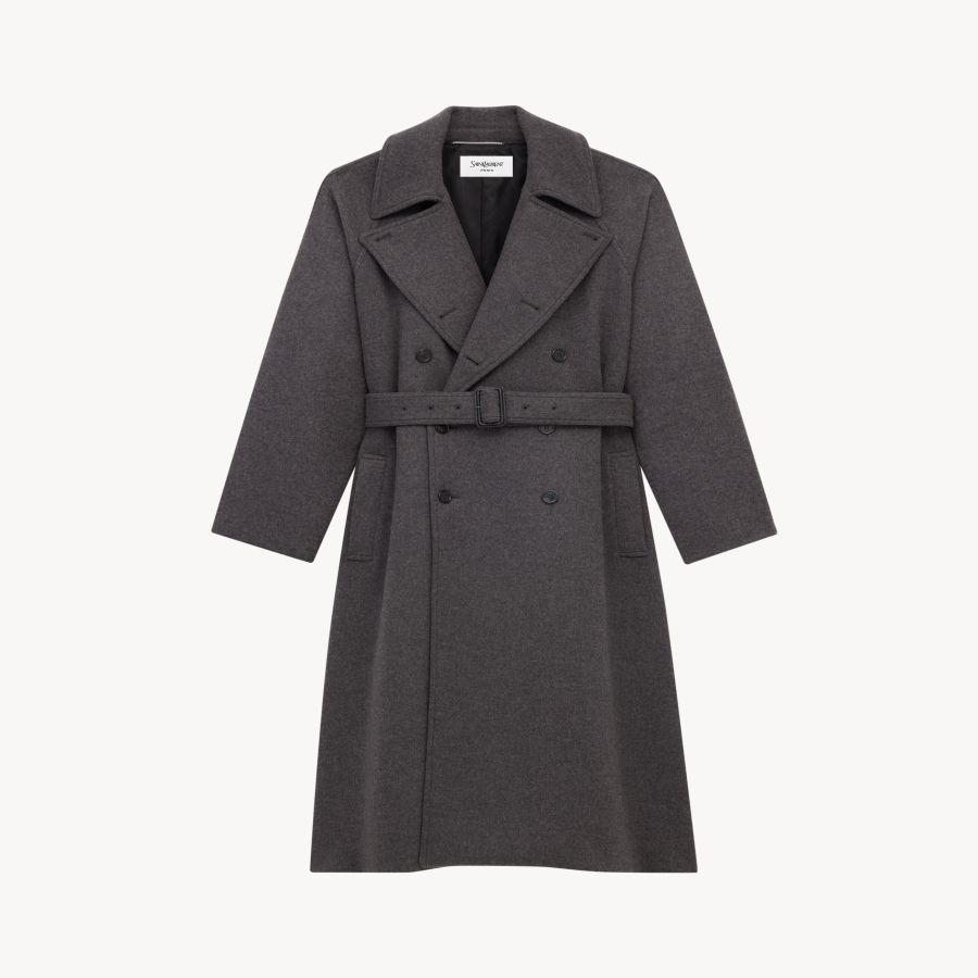 double-breasted, eight-button long coat featuring a two-way ulster collar, raglan sleeves, and an adjustable and removable belt.