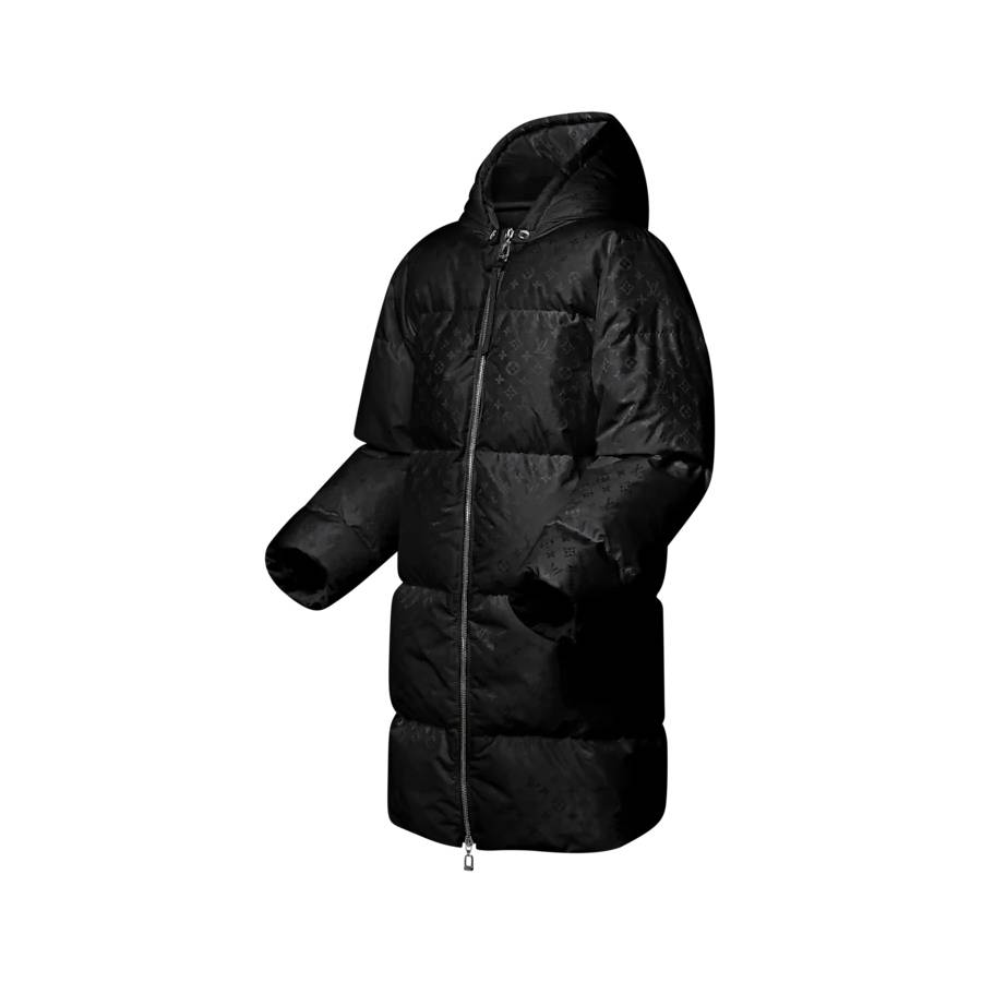 This puffer jacket is subtly signed all over with a tone-on-tone Monogram motif printed on lightweight nylon. It is cut in a long, oversized shape with down filling to amp up the coziness. It has practical cold-weather appeal thanks to a removable hood, elasticized cuffs and a versatile double-ended zipper finished with a leather pull.