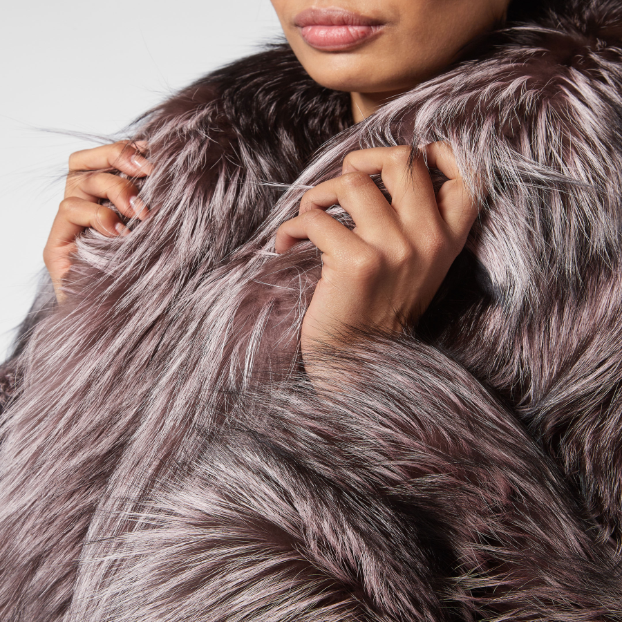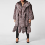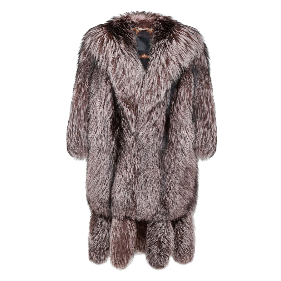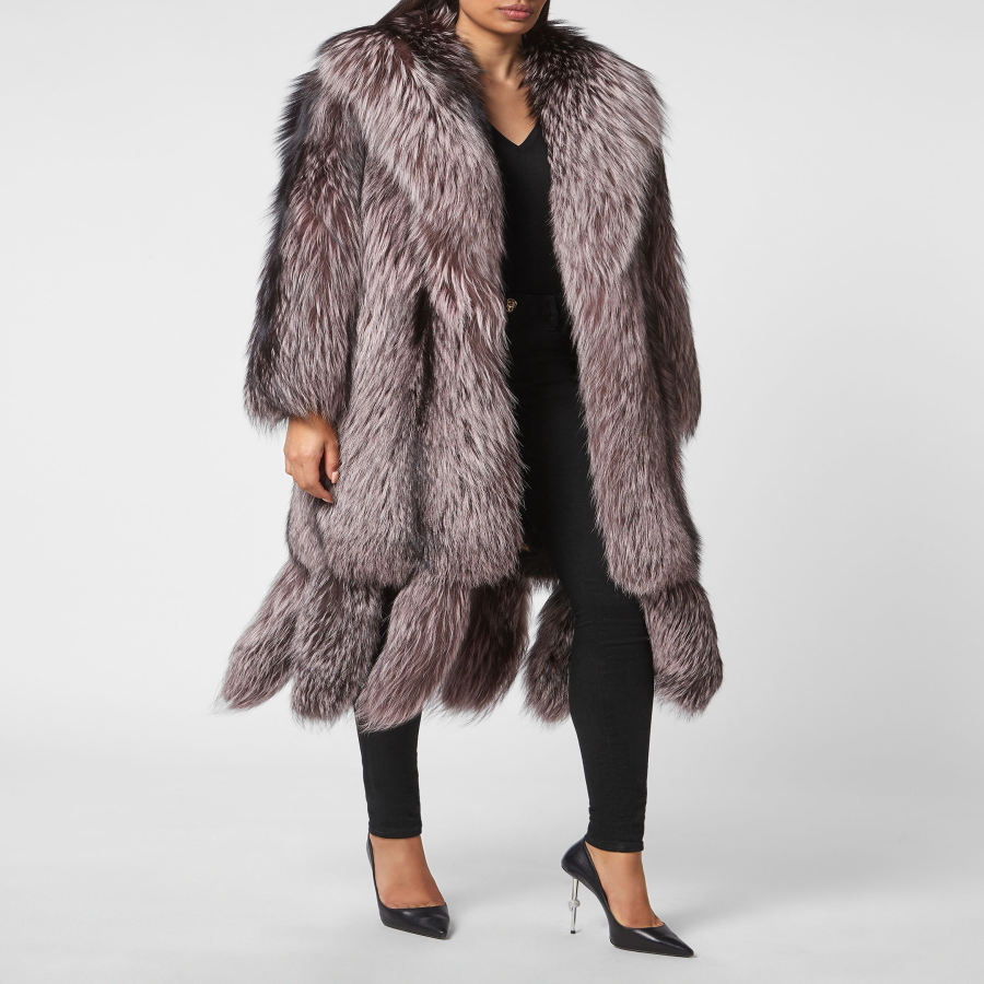 Find the Diva within with this pink-effect silver fox fur long coat. The fox tails on the bottom hem elevate your look to pure luxury. Concealed hook fastening. Dappled lining.