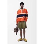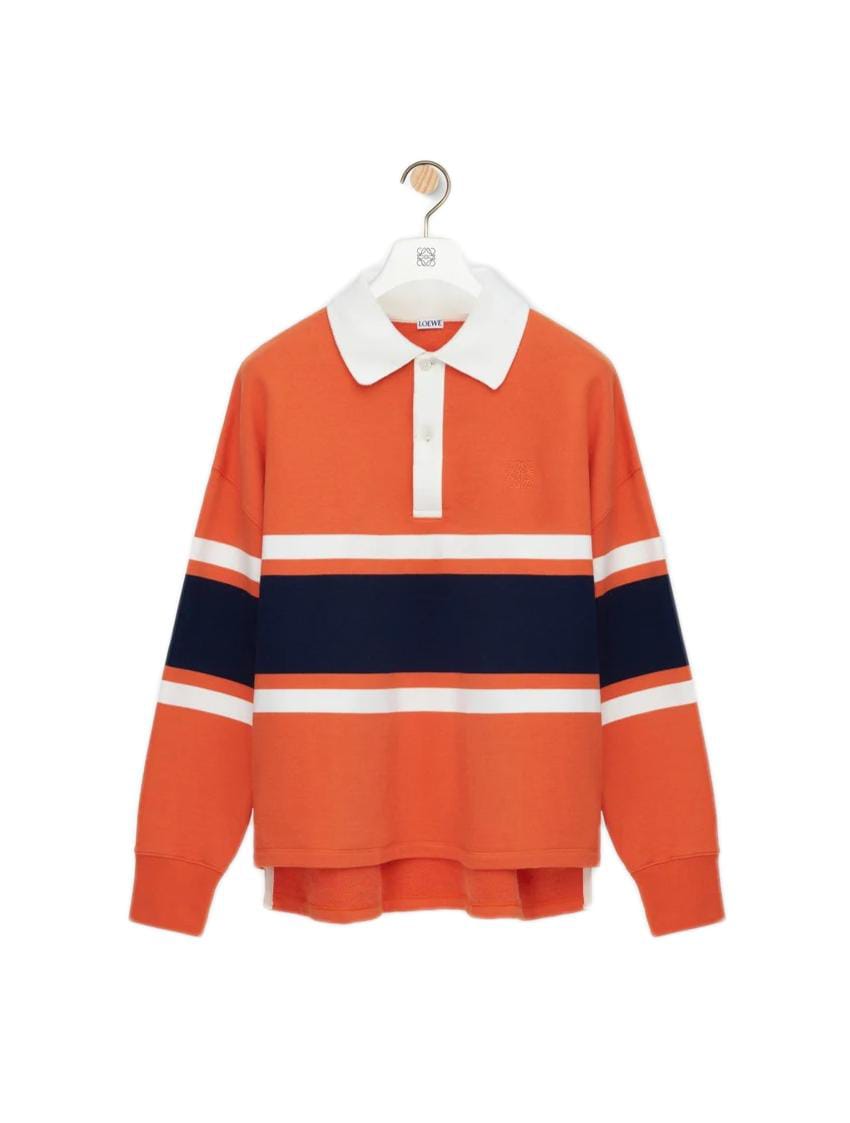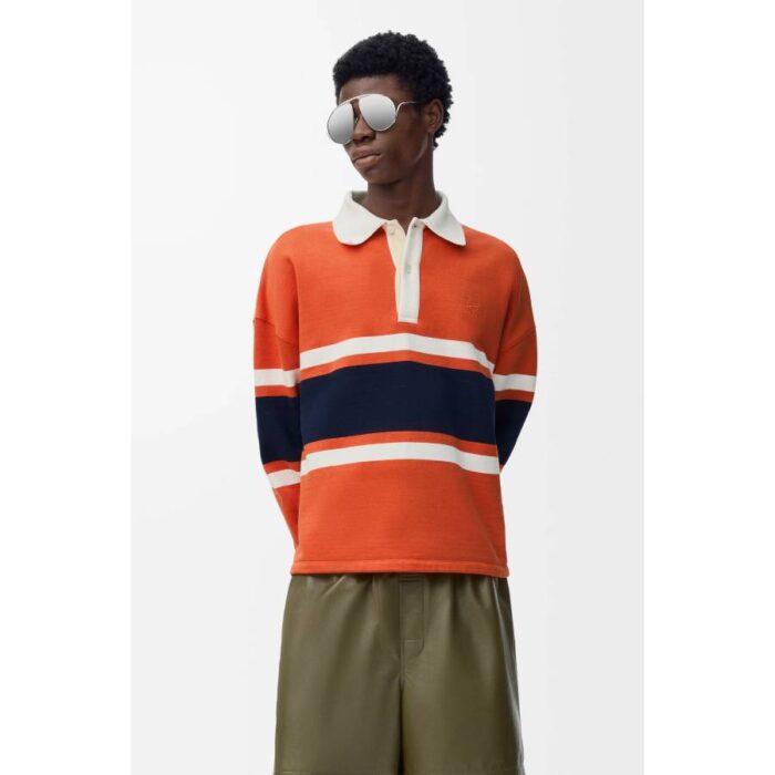 Polo shirt in medium-weight loopback cotton fleece jacquard featuring wide stripes across the front, back and sleeves, and a contrast collar.