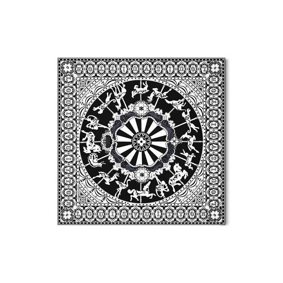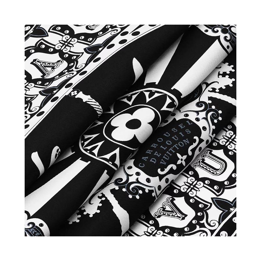 The refined and feminine LV Carrousel square features an intricate design infused with whimsical childlike charm. Expertly printed on pure silk, it depicts an enchanting carousel accented with subtle references to the iconic Monogram pattern. A Louis Vuitton signature border adds an extra House touch to this sophisticated, elegant accessory.