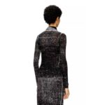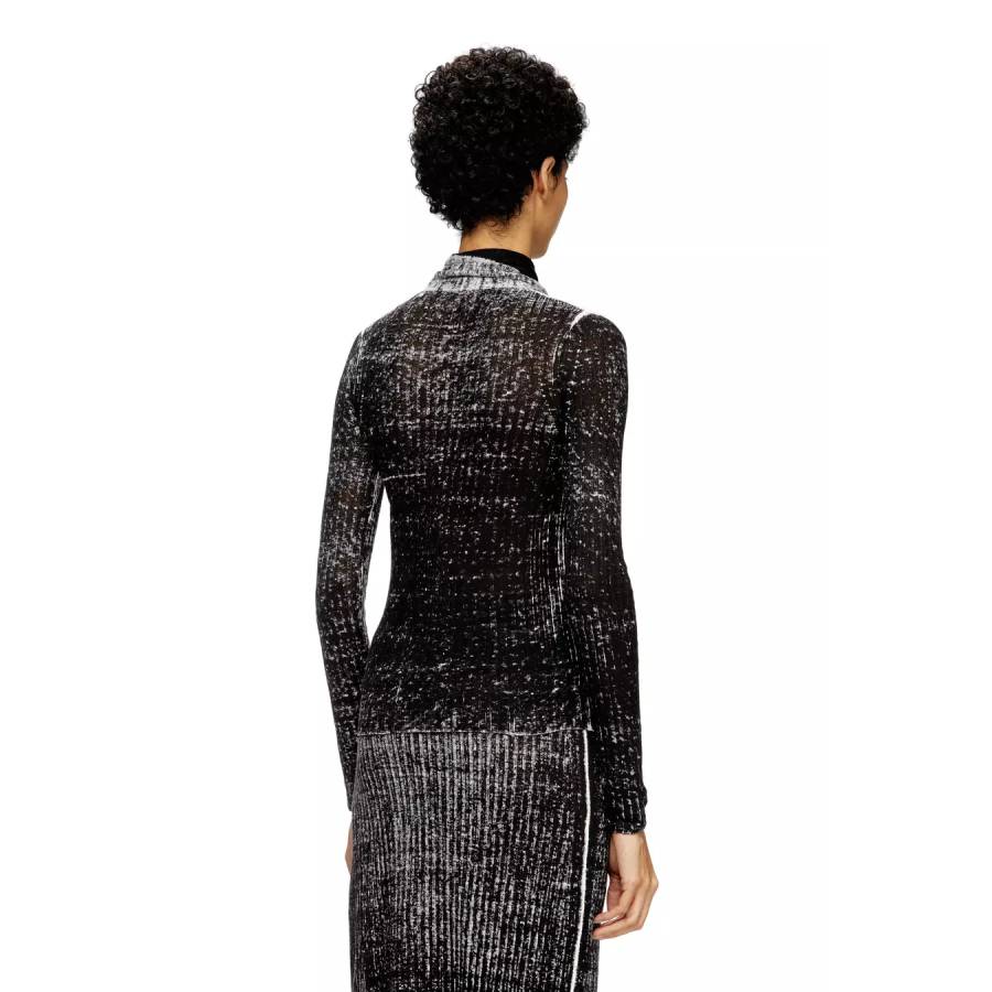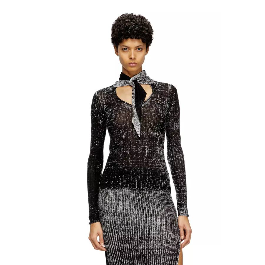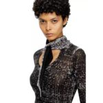 Womens ribbed turtleneck sweater in 100% low-impact linen. Decorated with a cut-out and embroidered Oval D logo on the chest, this black style features self-fabric neck ties that resemble a scarf when knotted at the keyhole front. The uneven colour saturation is fully intentional, courtesy of printing on the inside of the garment.