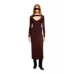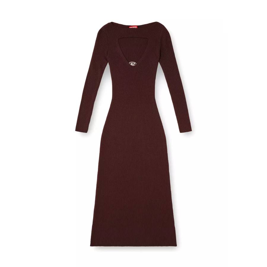 Midi wool dress with long sleeves, featuring a regular fit and a wrap-around silhouette. Crafted with 2×2 ribbing across the entire surface, it is distinguished by a triangle intarsia at the neckline. The Oval D logo is located at the lower corner of the cut-out, adding a distinctive element.