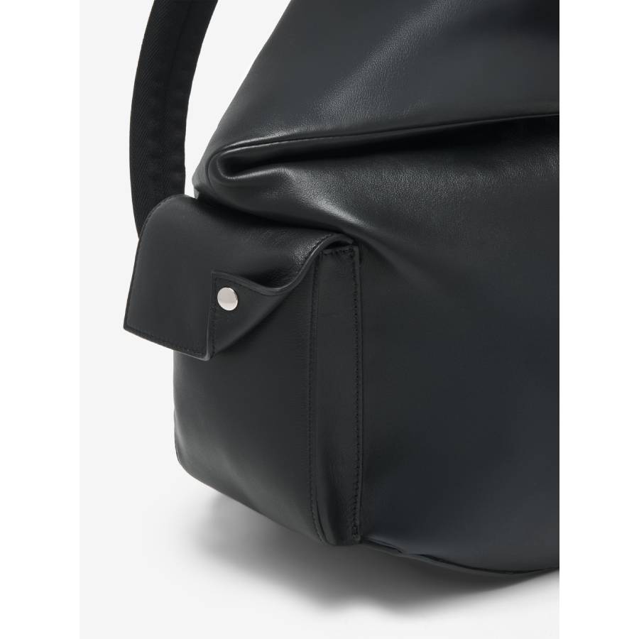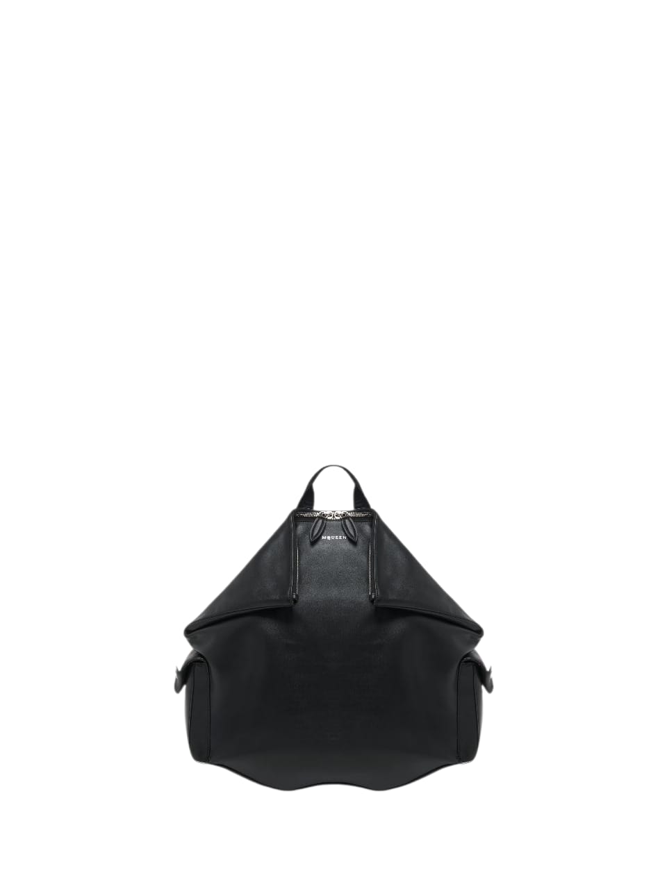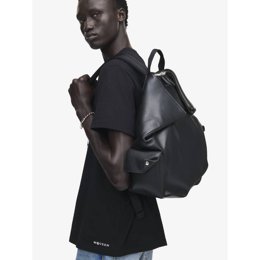 The Manta Backpack – a reinterpretation of an iconic archival silhouette in black nappa calf leather. Made in a sculptural construction with folded upper edges with folded upper edges and a rigid wave-shaped base. Featuring adjustable padded shoulder straps and two side pockets with folded flap detailing. Finished with a high-frequency McQueen logo print on the front.