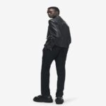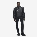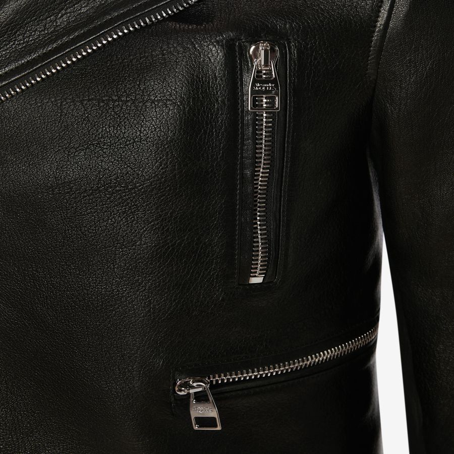 - Black soft grain leather biker jacket detailed with McQueen signature snap buttons and hammered stud zip detailing in silver finishing.