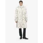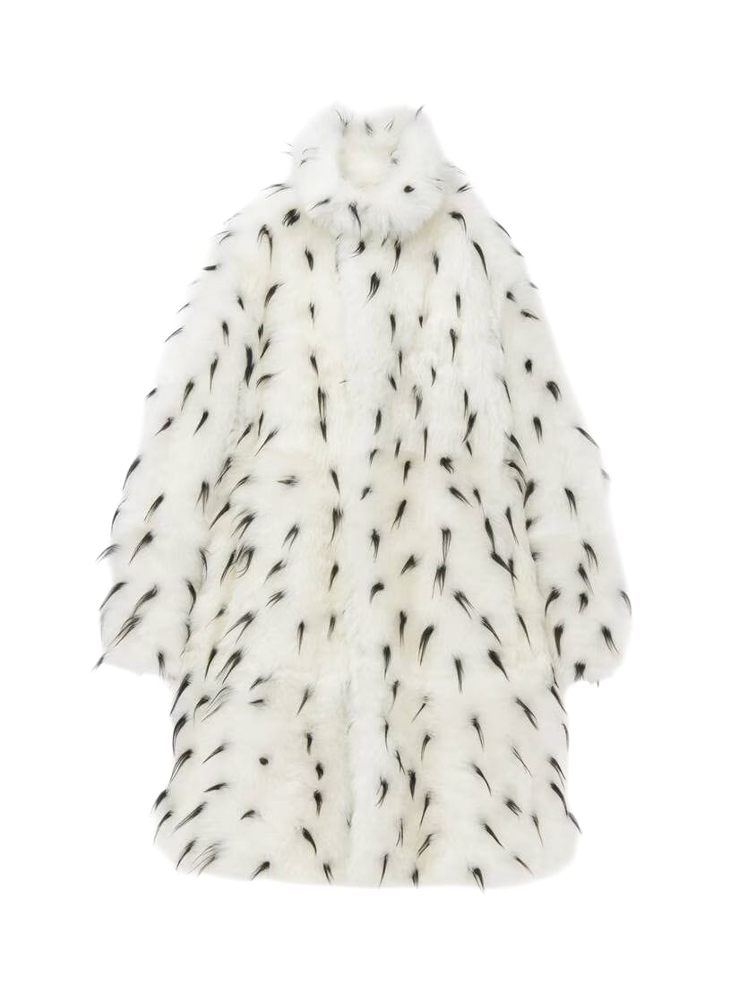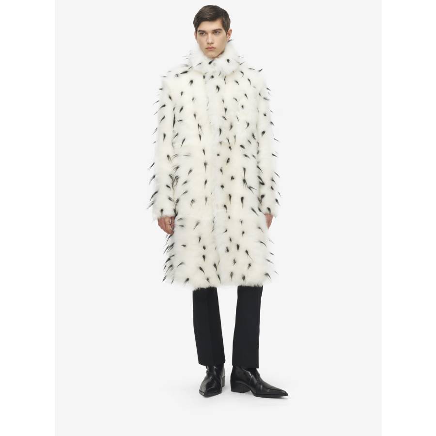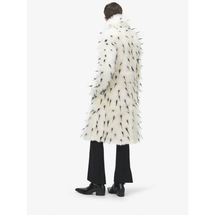 Knee-length coat in ivory shearling with black accents. Stand collar and side pockets. Finished with a concealed front fastening with lambskin detailing.