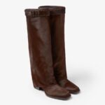 Square toe boots with tubular leg. Made by hand in dark brown cavallino calfskin. The leg partially covers the heel creating a trompe-l’oeil effect and soft creases on the front. FF strap at the knee, finished with hand-sewn tone-on-tone macro Selleria stitching, an emblem of the iconic Selleria workmanship handed down through generations of Fendi artisans since 1925. Gold-finish metalware.