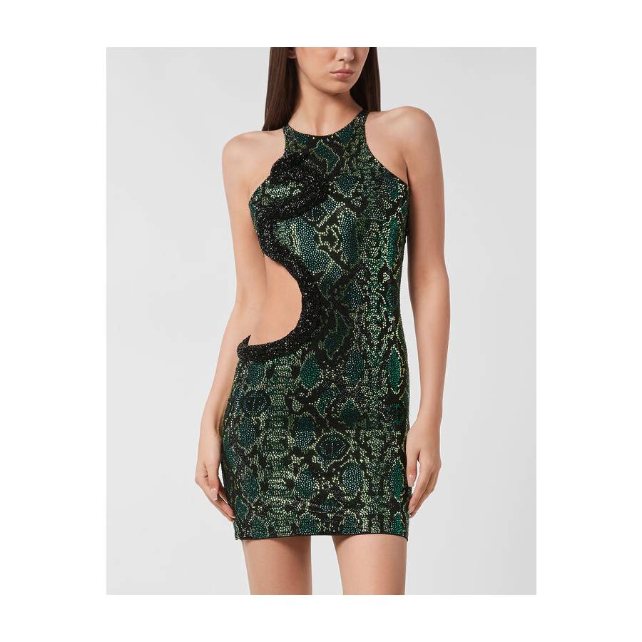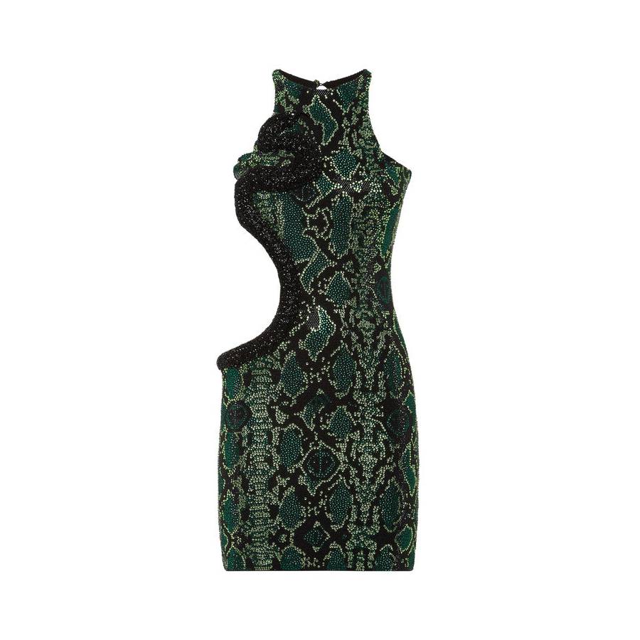 ● Rhinestone appliqués create a python skin pattern