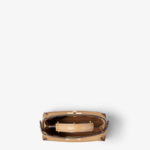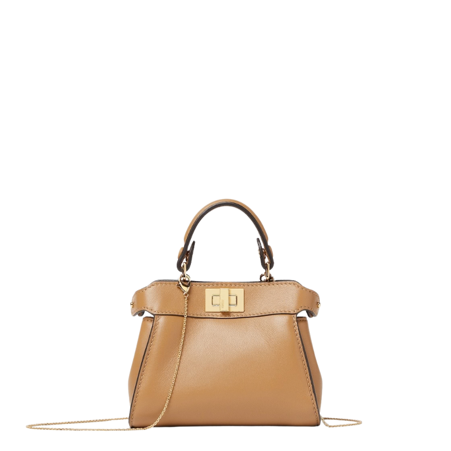 Iconic Nano Peekaboo bag with every detail recreated. Featuring a leather-lined interior, two compartments separated by a stiff partition, a removable handle with two press studs and the classic twist lock. Can be carried by hand or worn cross-body thanks to the fine chain shoulder strap. Made of cappuccino-coloured nappa leather. Gold-finish metalware.