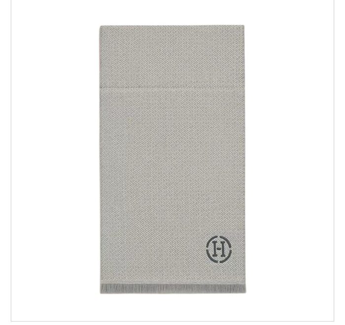 Entirely handmade in Nepal, the weave of this cashmere scarf allows understated “H” designs to appear. Each scarf is signed with an embroidered leather “H”.