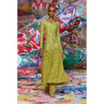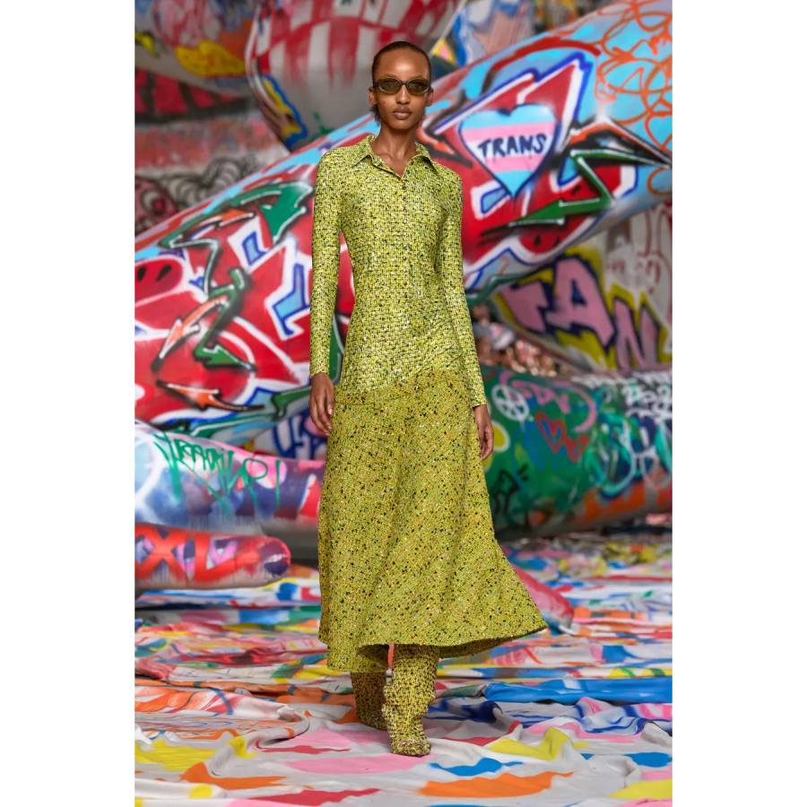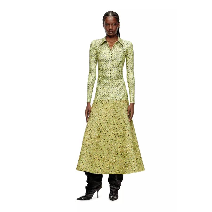 Real bouclé fabric meets its trompe l’oeil equivalent with this women’s skirt from Diesel’s FW25 Runway. Its smart A-line silhouette is completely subverted with a waist that sits so low, it’s barely on – held in place with a skin-tight Lycra insert.