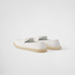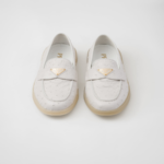 These loafers combine a modern silhouette with casual style with the refinement of prized yet durable ostrich leather recognized by its unmistakable “polka-dot” finish with a luxurious touch. The versatile design, characterized by a light rubber sole, is decorated with the iconic enameled metal triangle logo.
