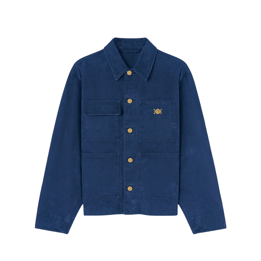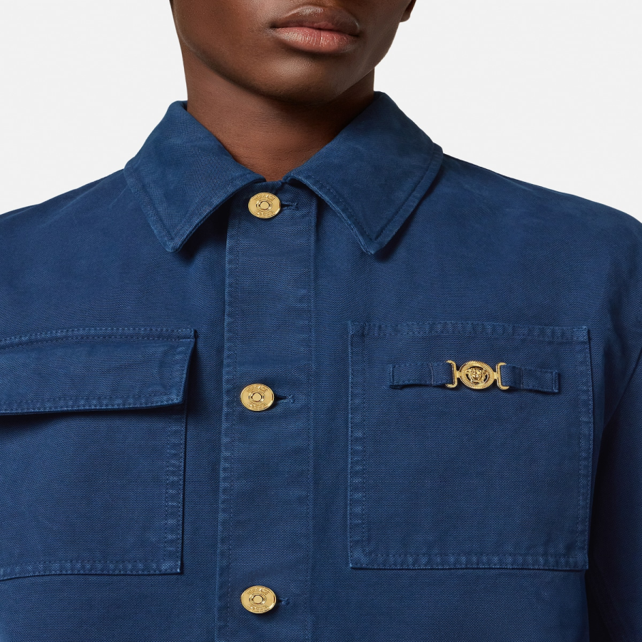 An overdyed cotton canvas carpenter jacket featuring multi-pockets and an accent Medusa Biggie hardware on the chest pocket.