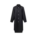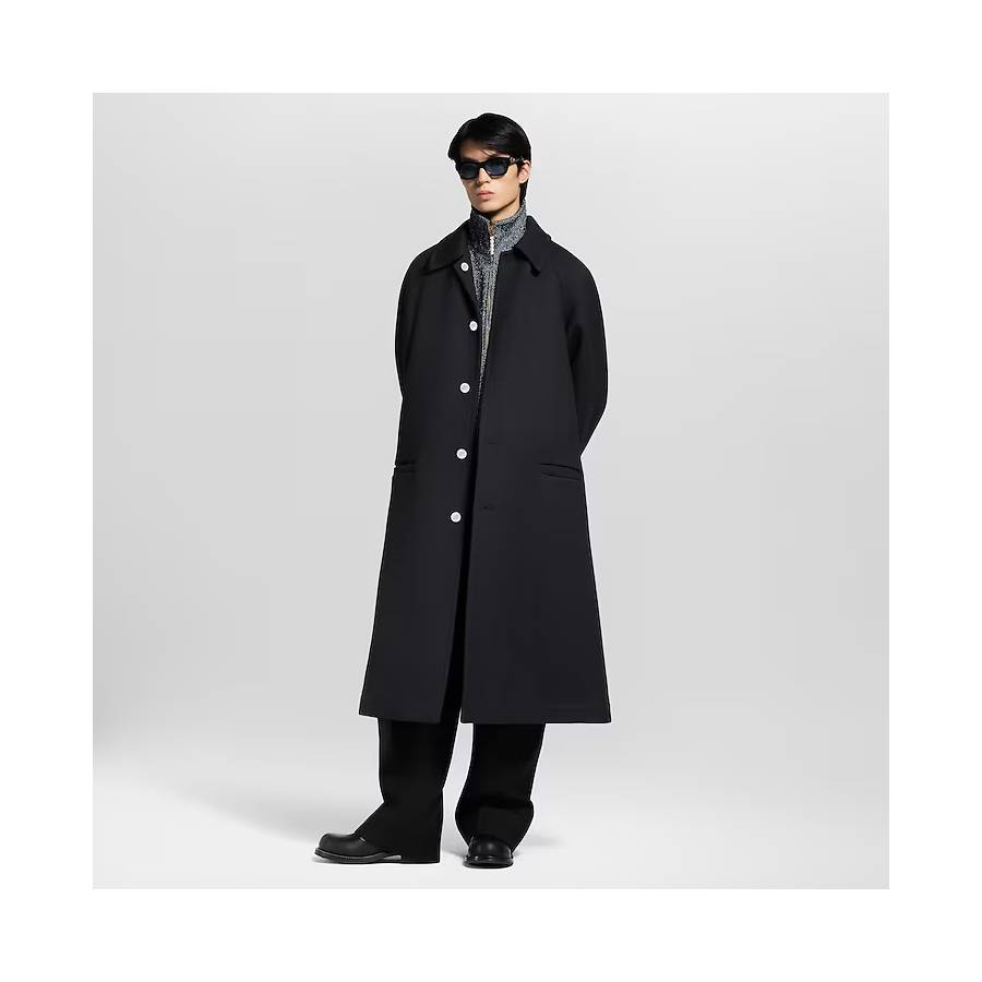 This single-breasted black coat is softly constructed in a double-face wool blend with an oversized silhouette. Mother-of-pearl effect buttons fasten up to the pointed collar, while a rear belt completes this elegant and timeless silhouette. Inside, the back is lined with a colorful silk panel adorned with a sakura cherry blossom landscape print in a nod to this season’s collaboration with Nigo.